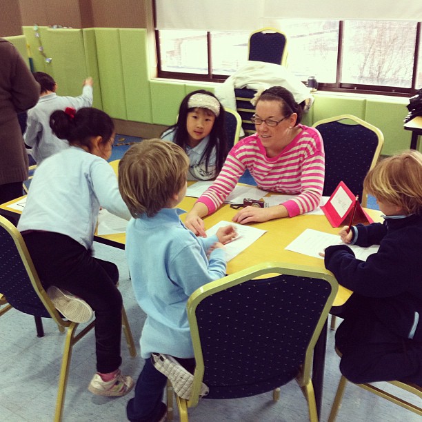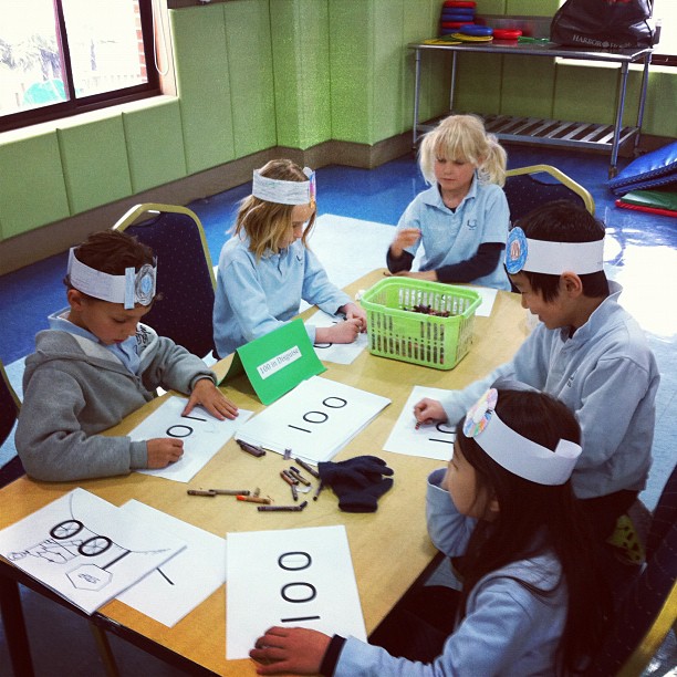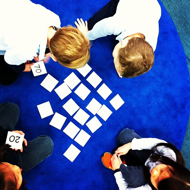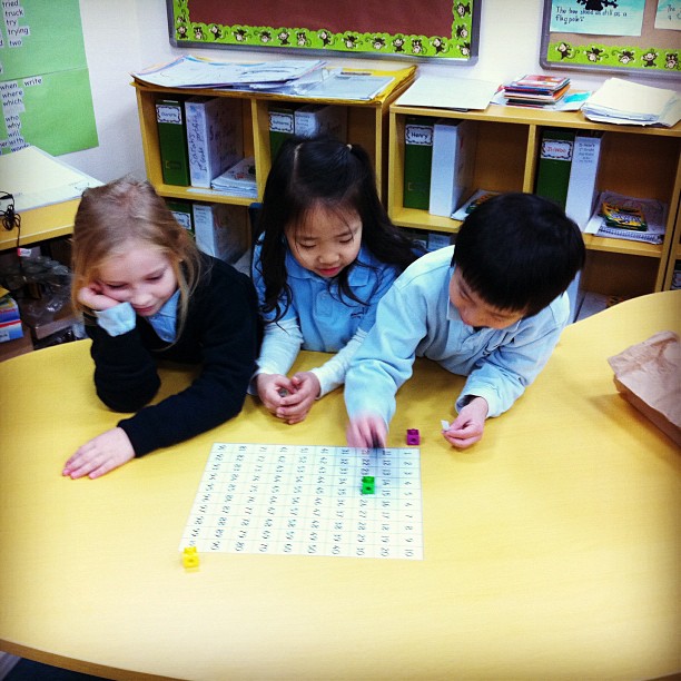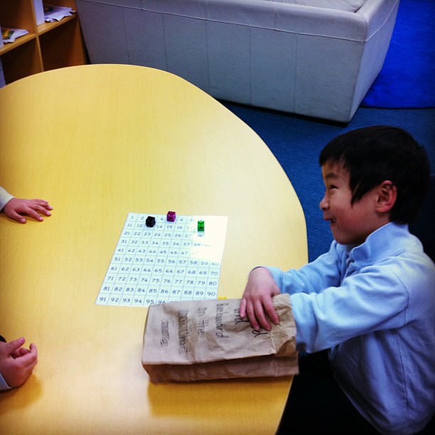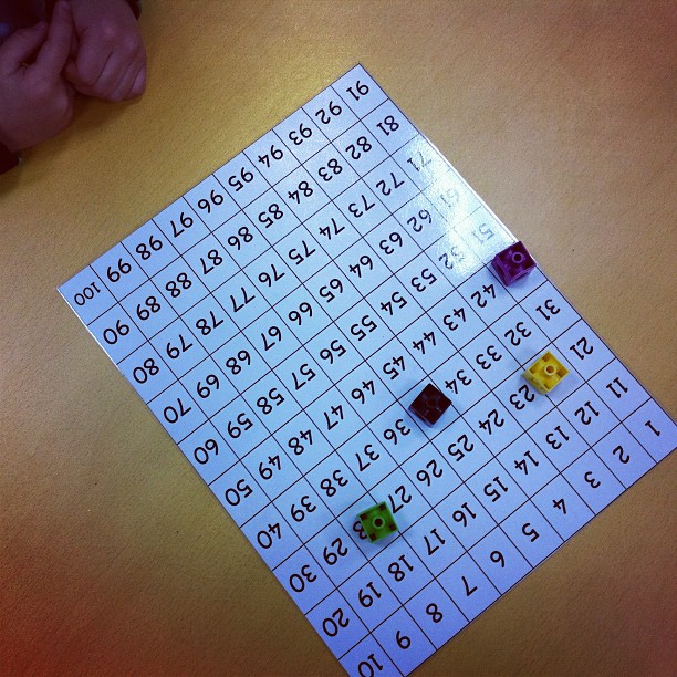 – Race to 100– Using a large 100′s chart, each student starts on 0. Taking turns, they each pull out cards from a bag that instruct them to add or subtract different numbers. The goal is to reach the number 100 first. You should have heard their squeals when they’d pull out a +10 card (and their groans when the card read -10). =)