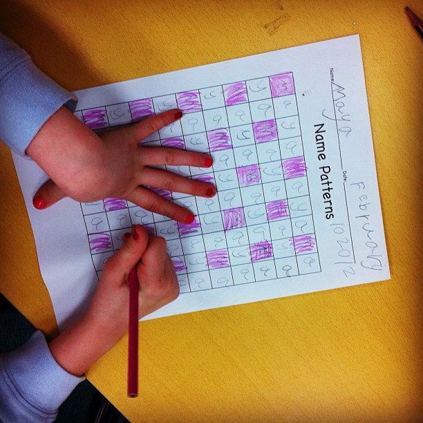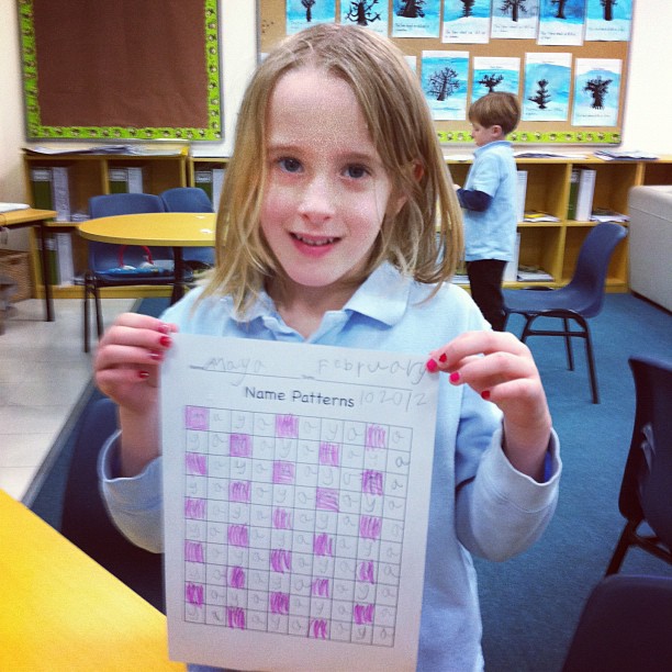 100 Chart Name Patterns– Students received a blank 100′s chart and wrote their name repeatedly in the boxes. Then, they colored the first letter of their names and compared the patterns they created.