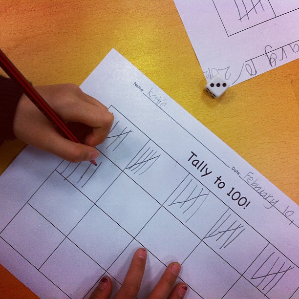 – Tally to 100– Students received a page with a 20-box grid. Each box could hold 5 tally marks. Students took turns rolling a dice and would write the number in tally marks. The first to reach 100 was a winner. This activity really got them focused and thinking, as there was often carry-over from one box to the next.