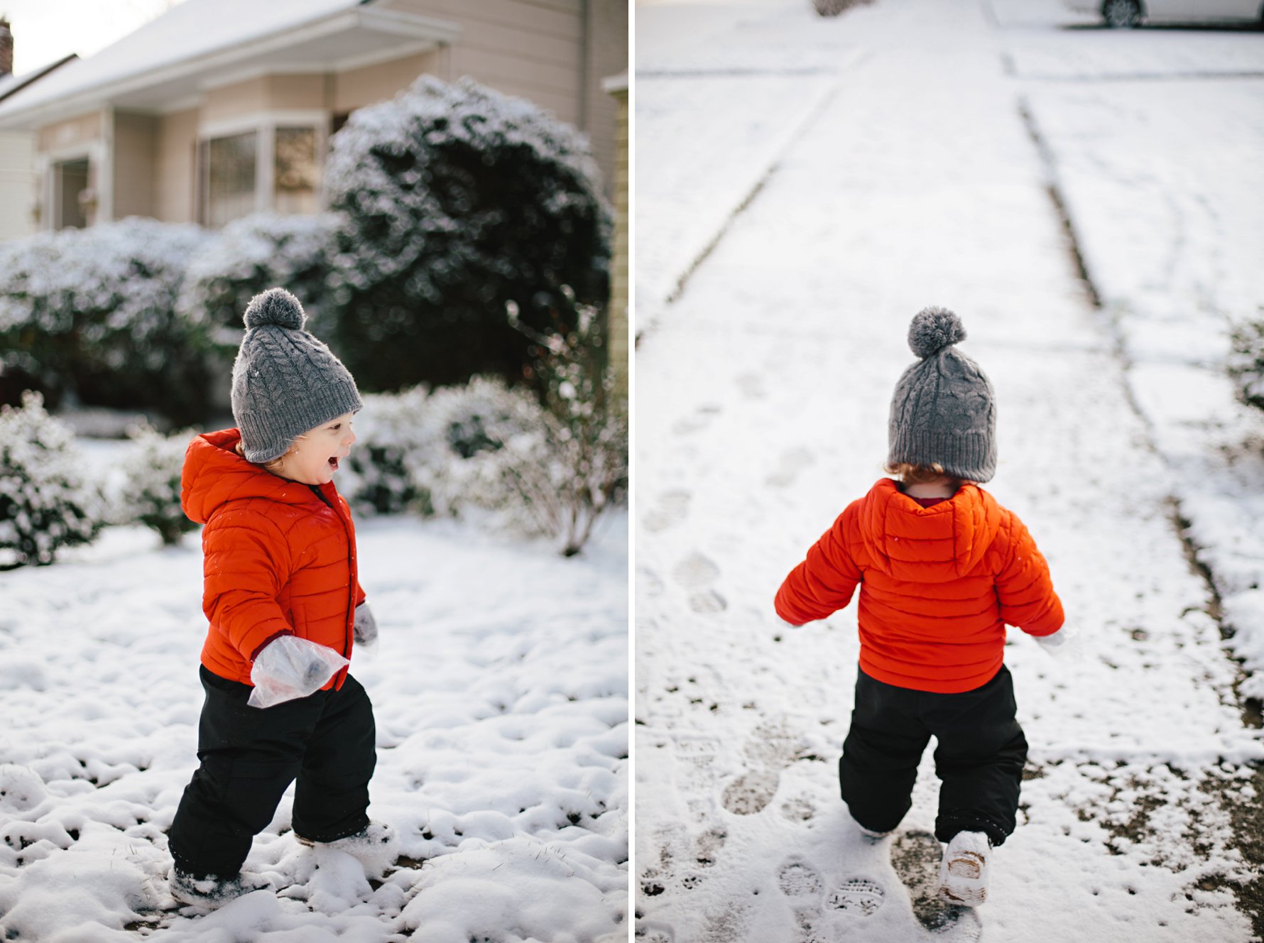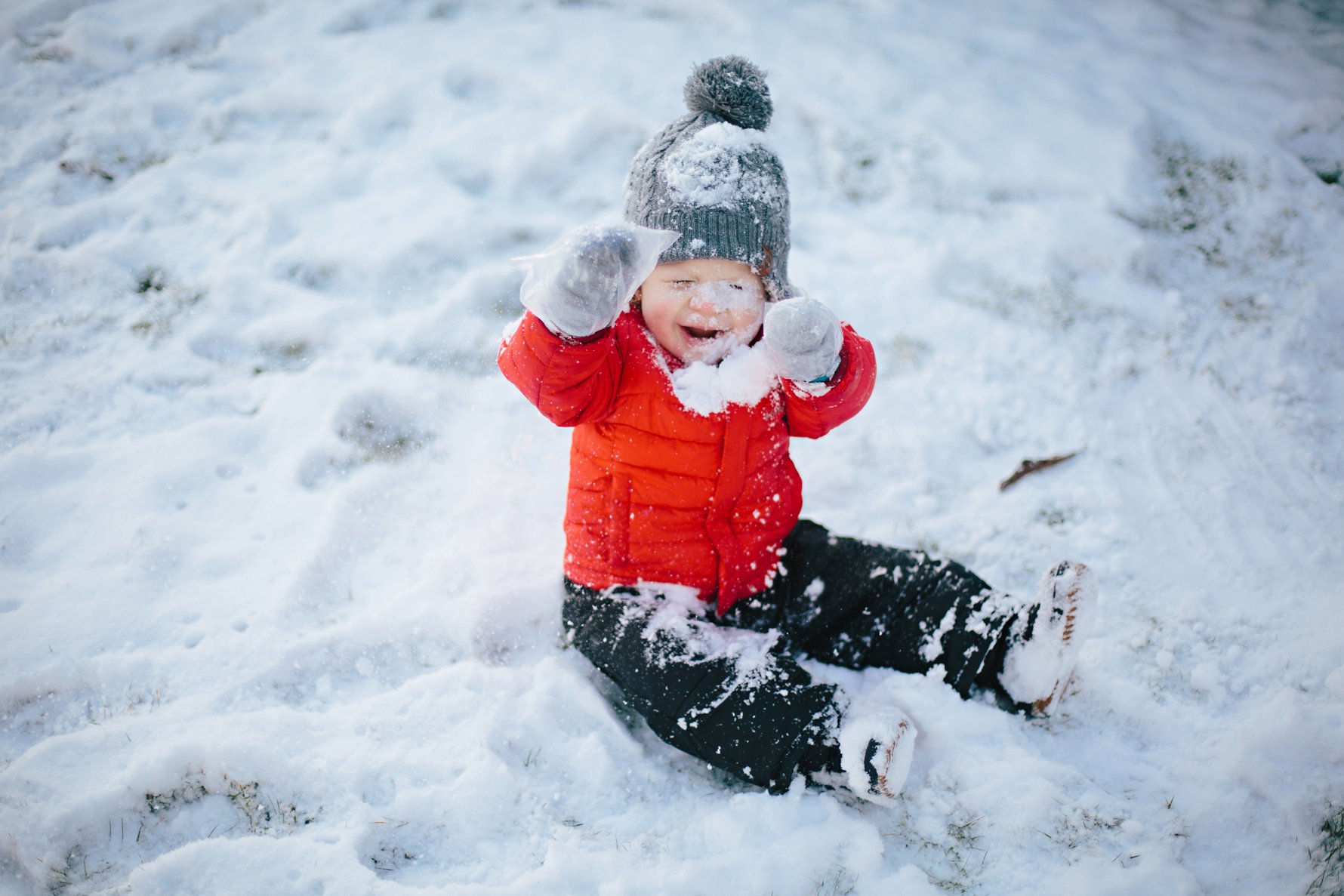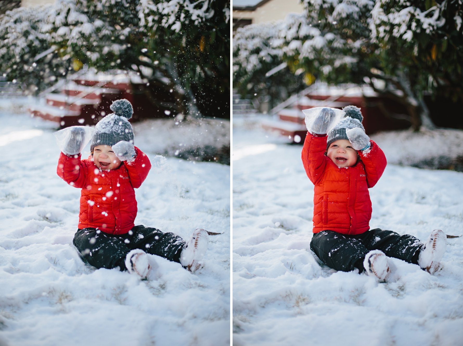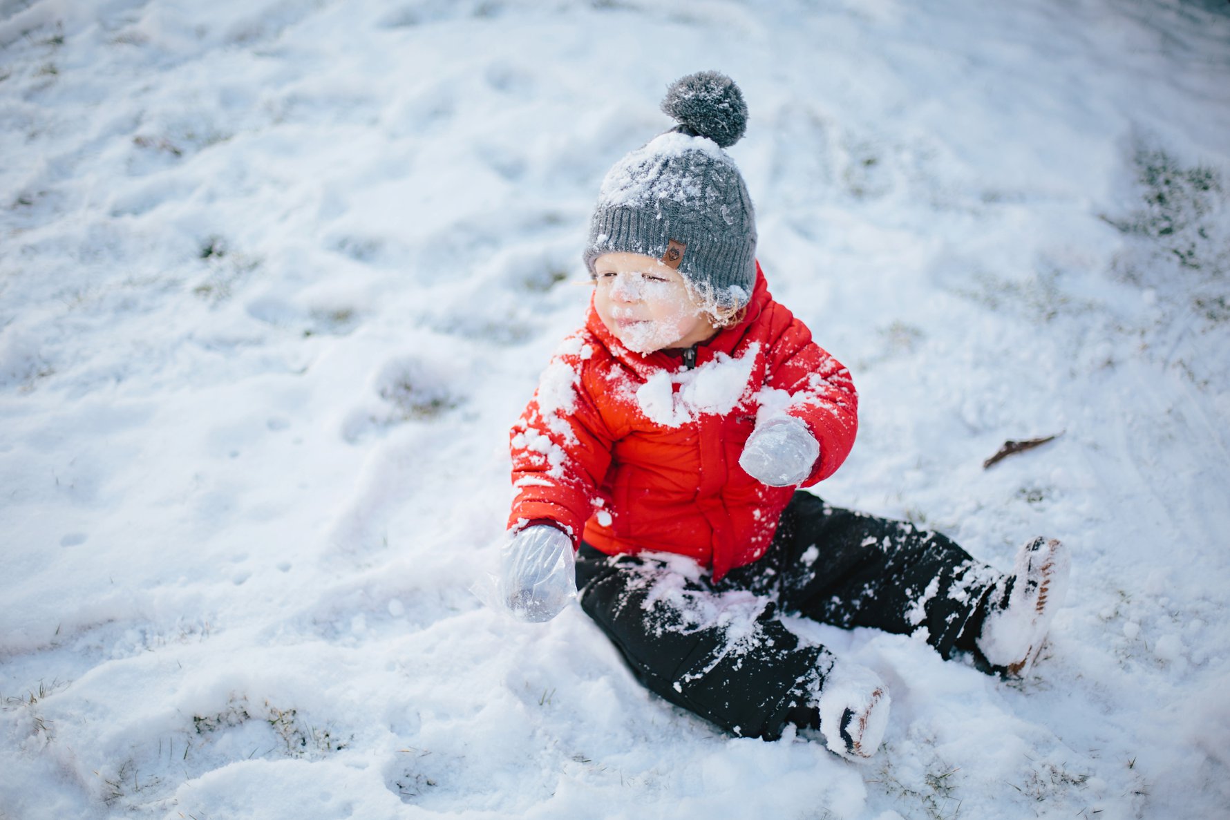 Isla eats all the snow.A couple of pairs of kid socks and some plastic baggies make for decent baby gloves! We’ll invest in some real gloves next year =)Cole did not take an interest in eating the snow .He did, however, think it was great fun when we “made it snow”.Until a blizzard hit. Oops. Sorry, buddy!