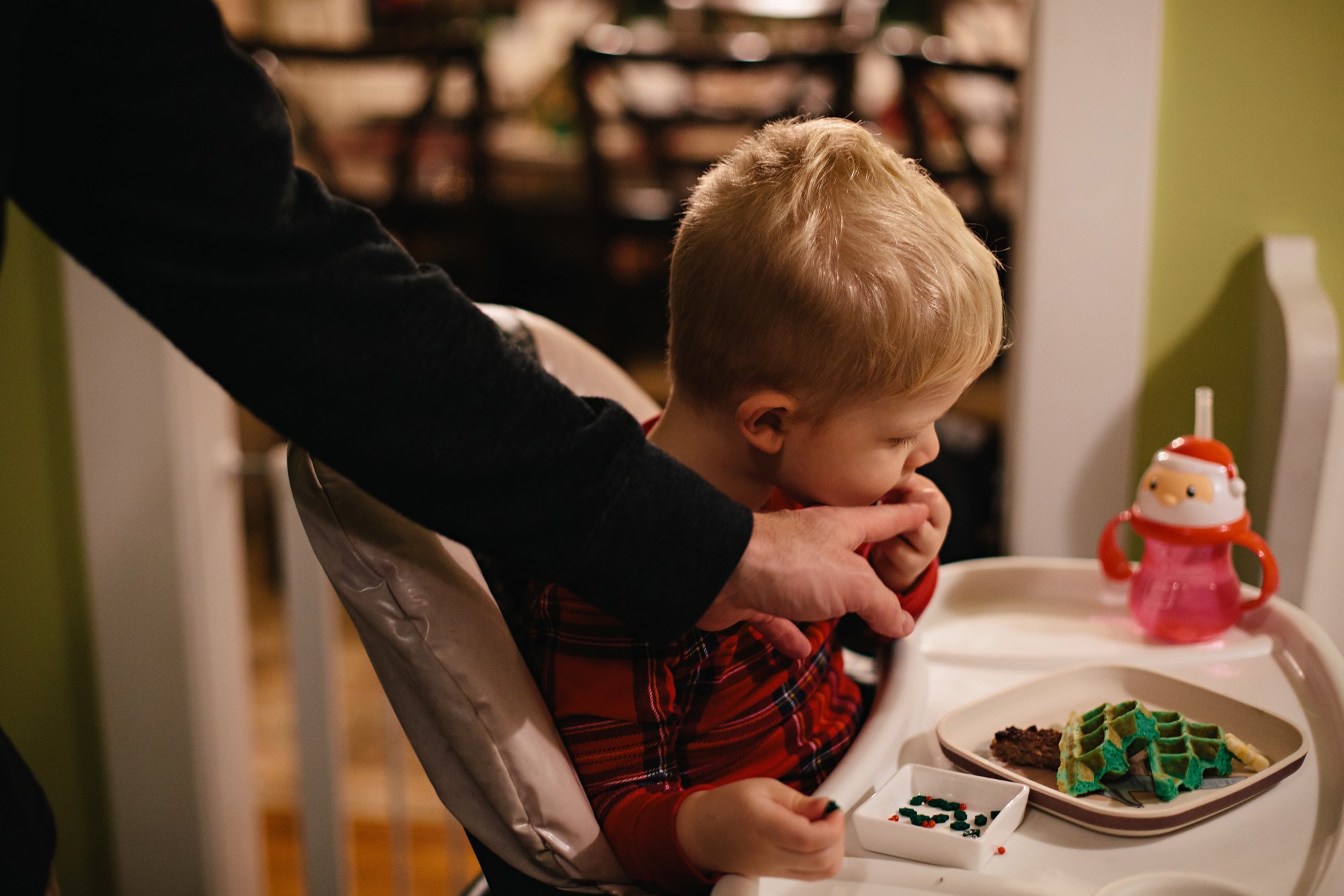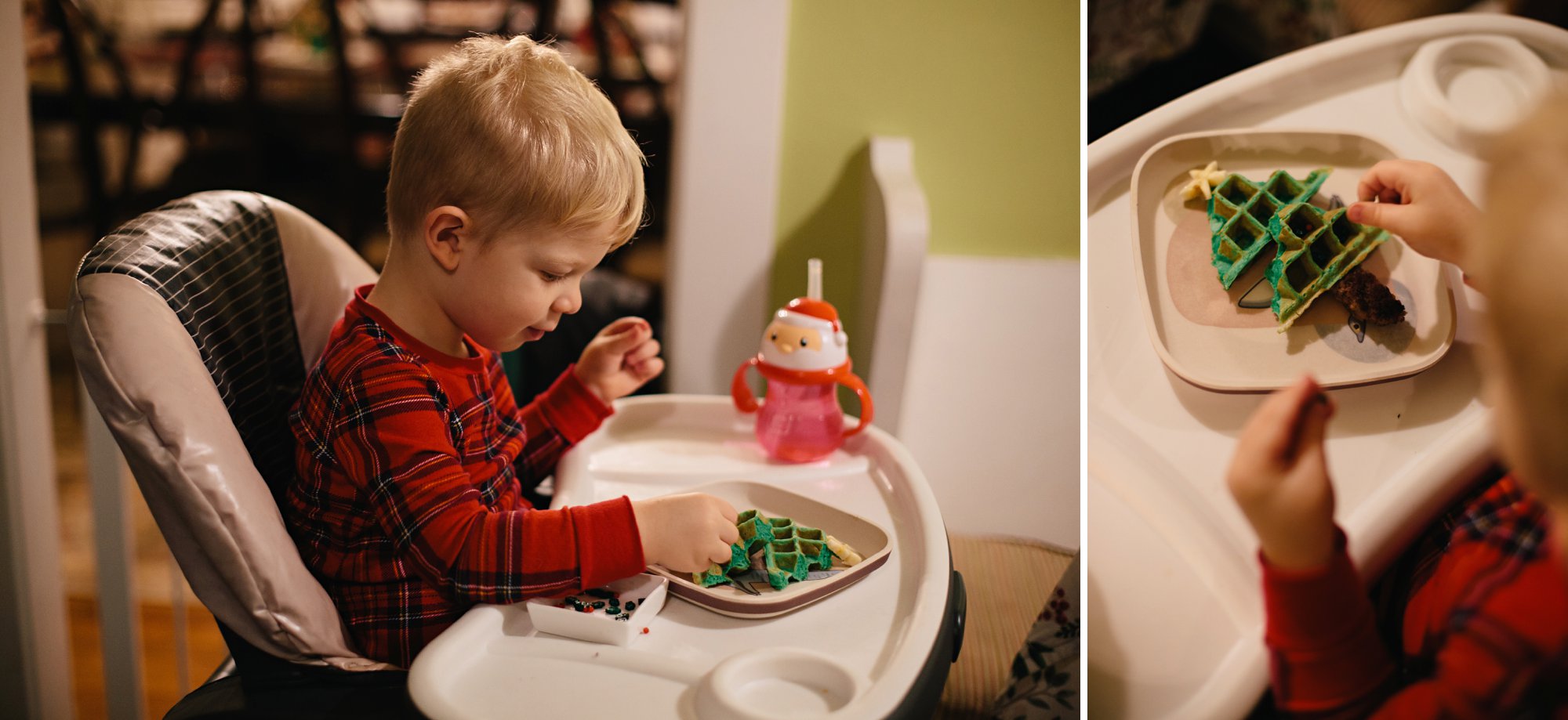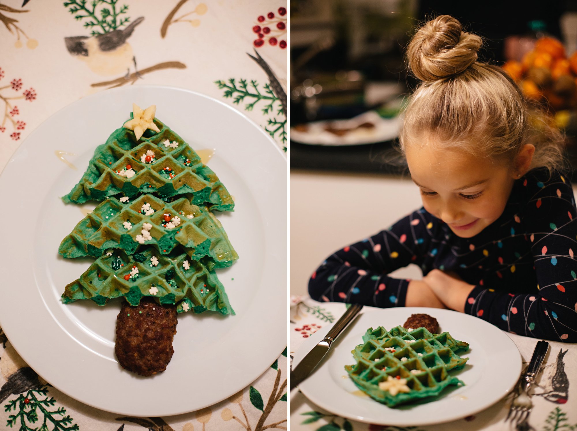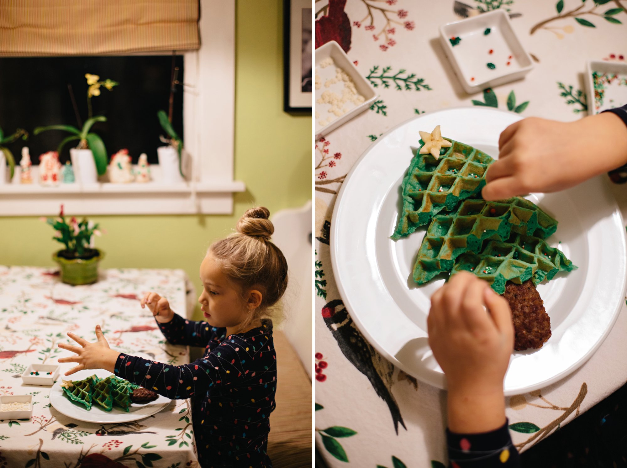 Knowing we had a jam-packed day, we opted to celebrate our advent activity first thing in the morning with Christmas Tree Waffles! A dash of green food coloring and a few sprinkles, and voila! A simple and festive breakfast that the kids enjoy decorating as much as devouring!