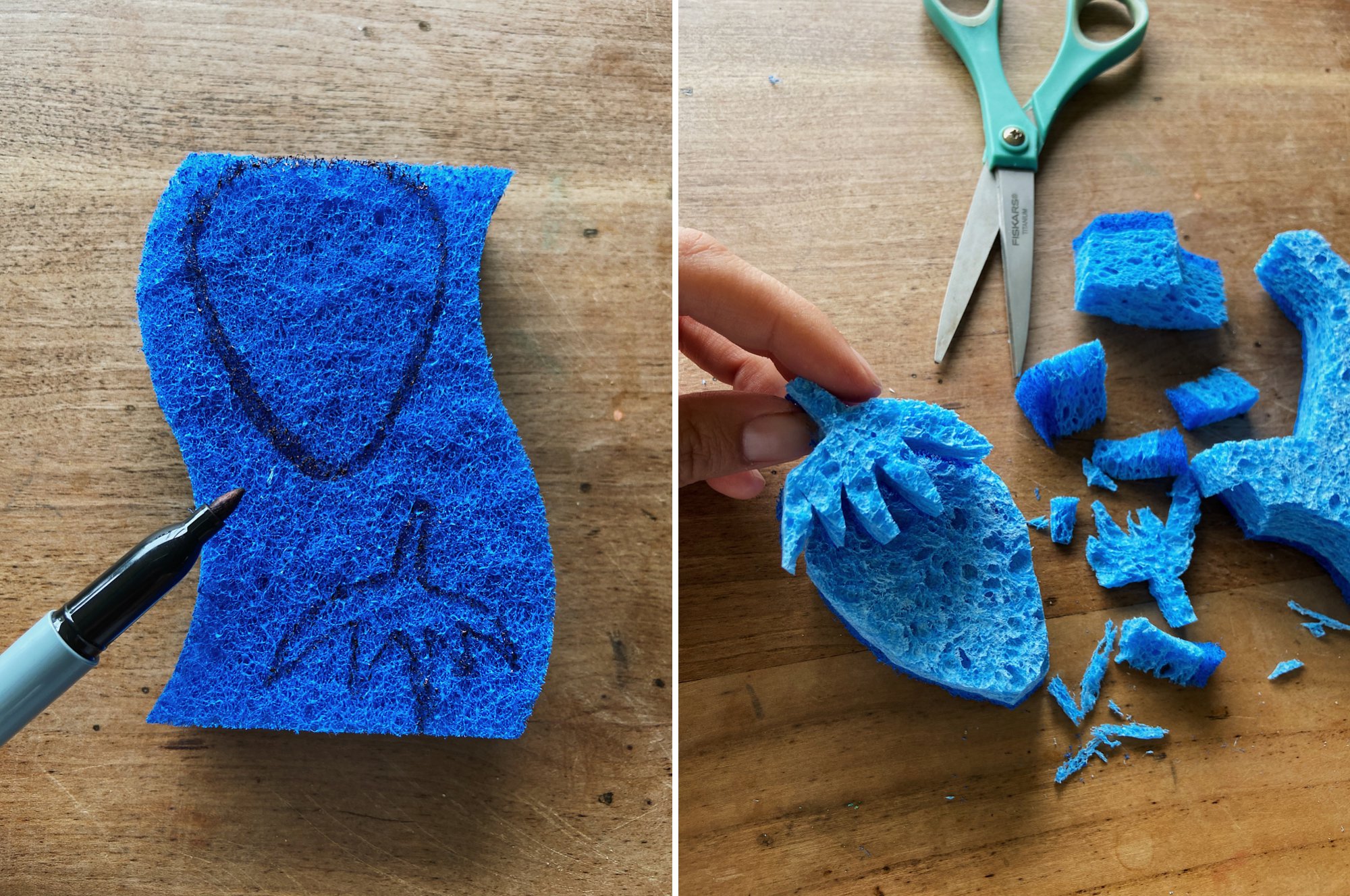• Use a sharpie to draw a strawberry and strawberry top on your sponge (make sure they are NOT attached)