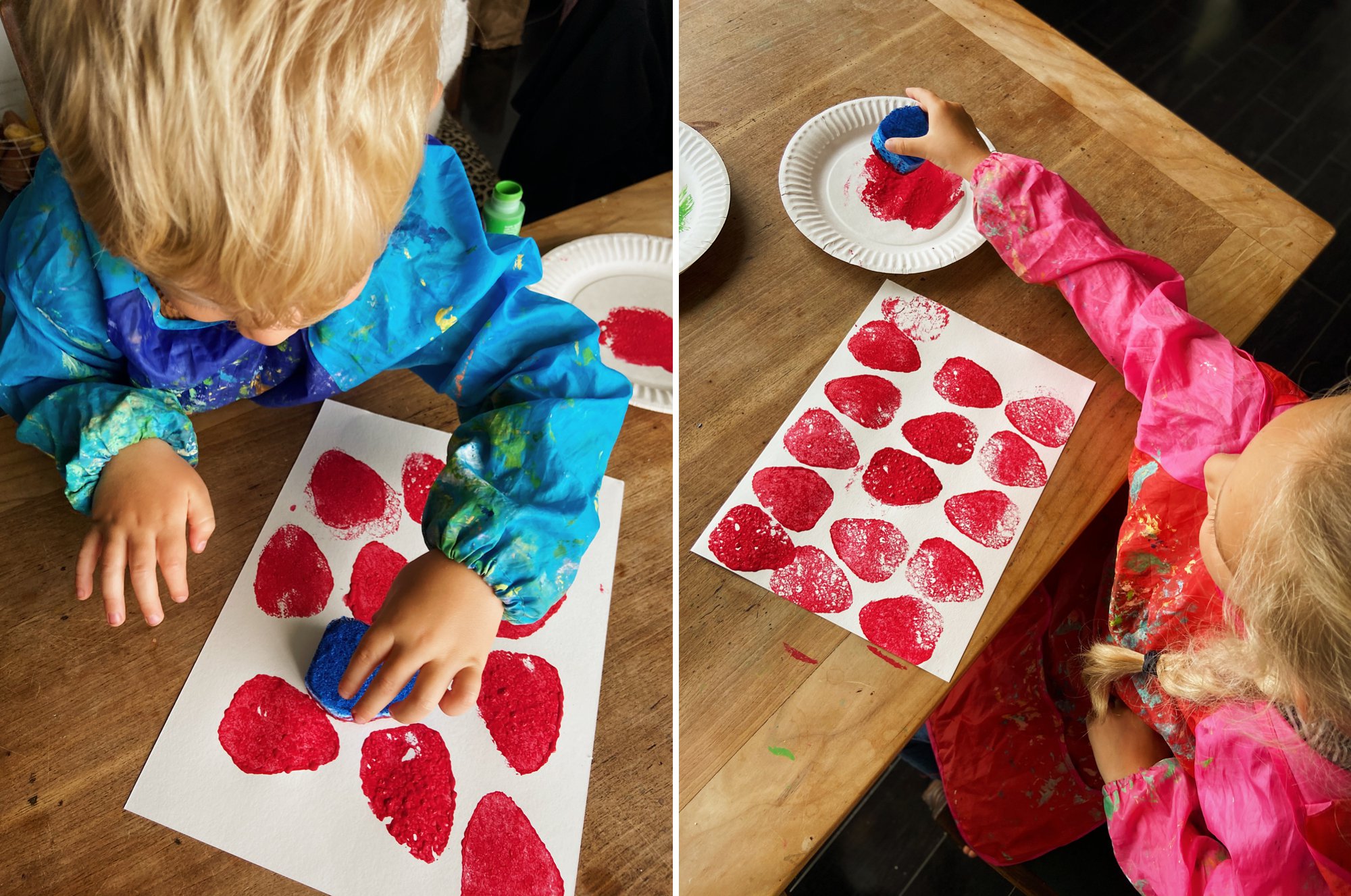 • When the red strawberry paintings have dried completely, stamp very lightly over them with a thin layer of pale pink paint to add texture (we stamped most of our pink paint onto a spare paper towel first and then used the very last bit to gently layer over the red)