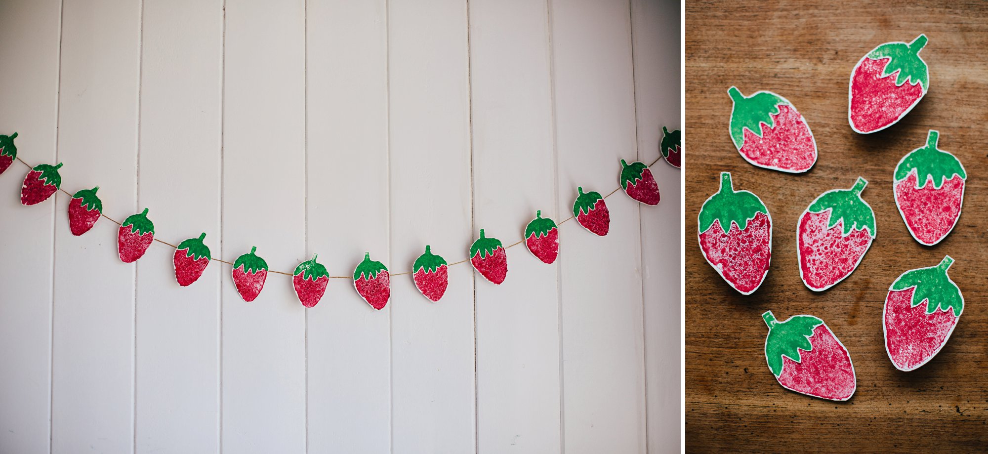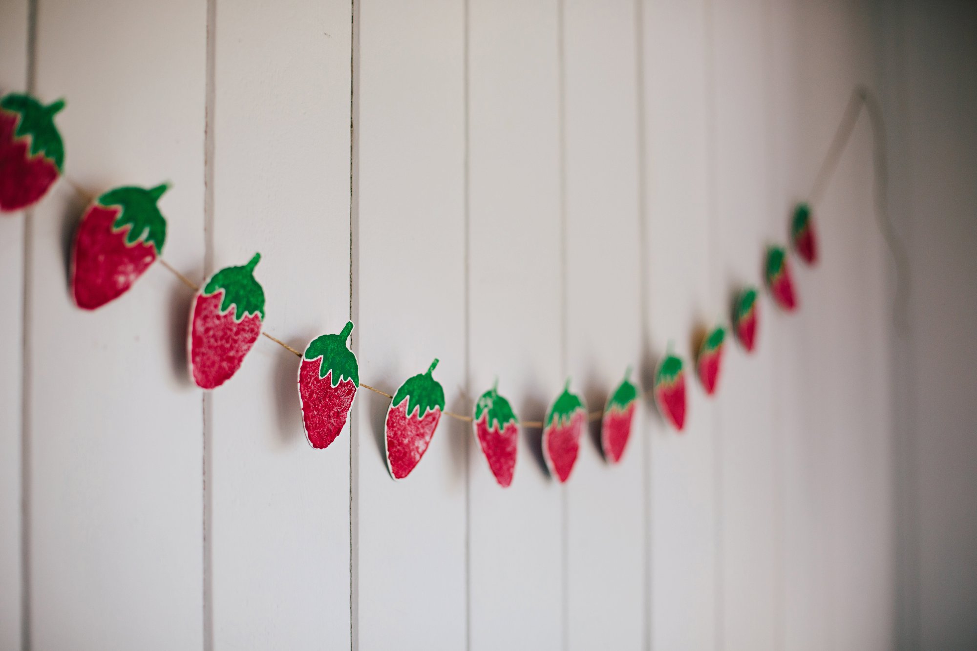 Decide how you would like to display your strawberries— string them in a garland, attach a magnet on the back, attach a clothespin on the back, glue to the front of blank cards, etc. The possibilities are endless!