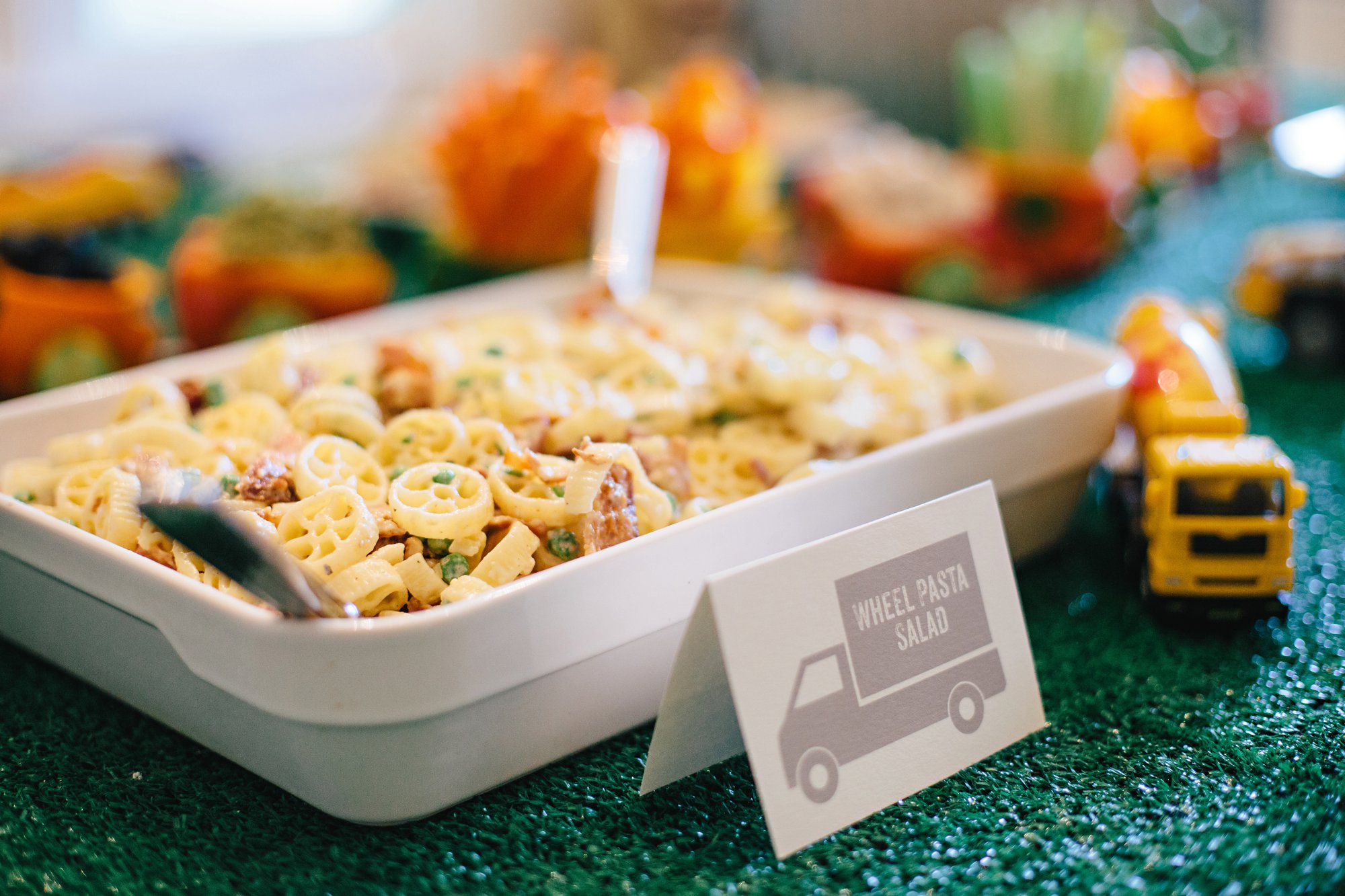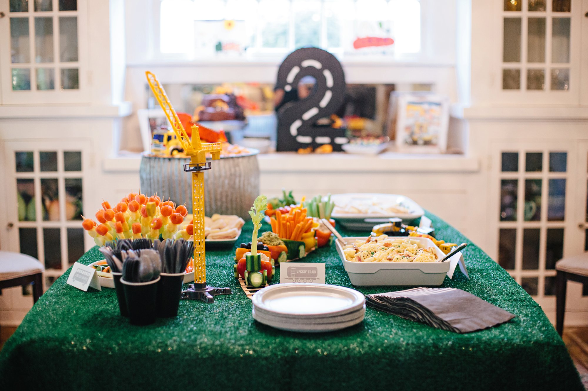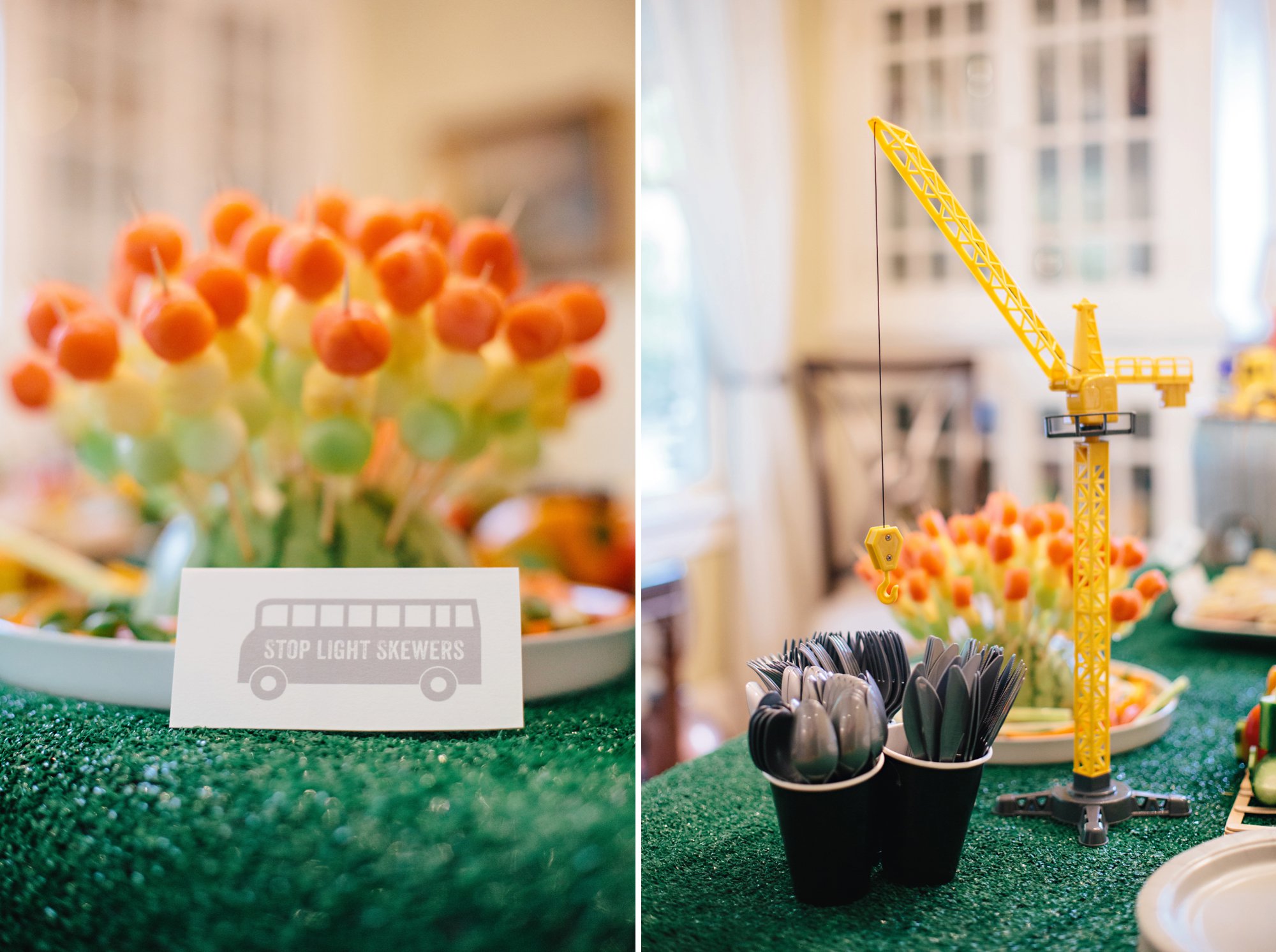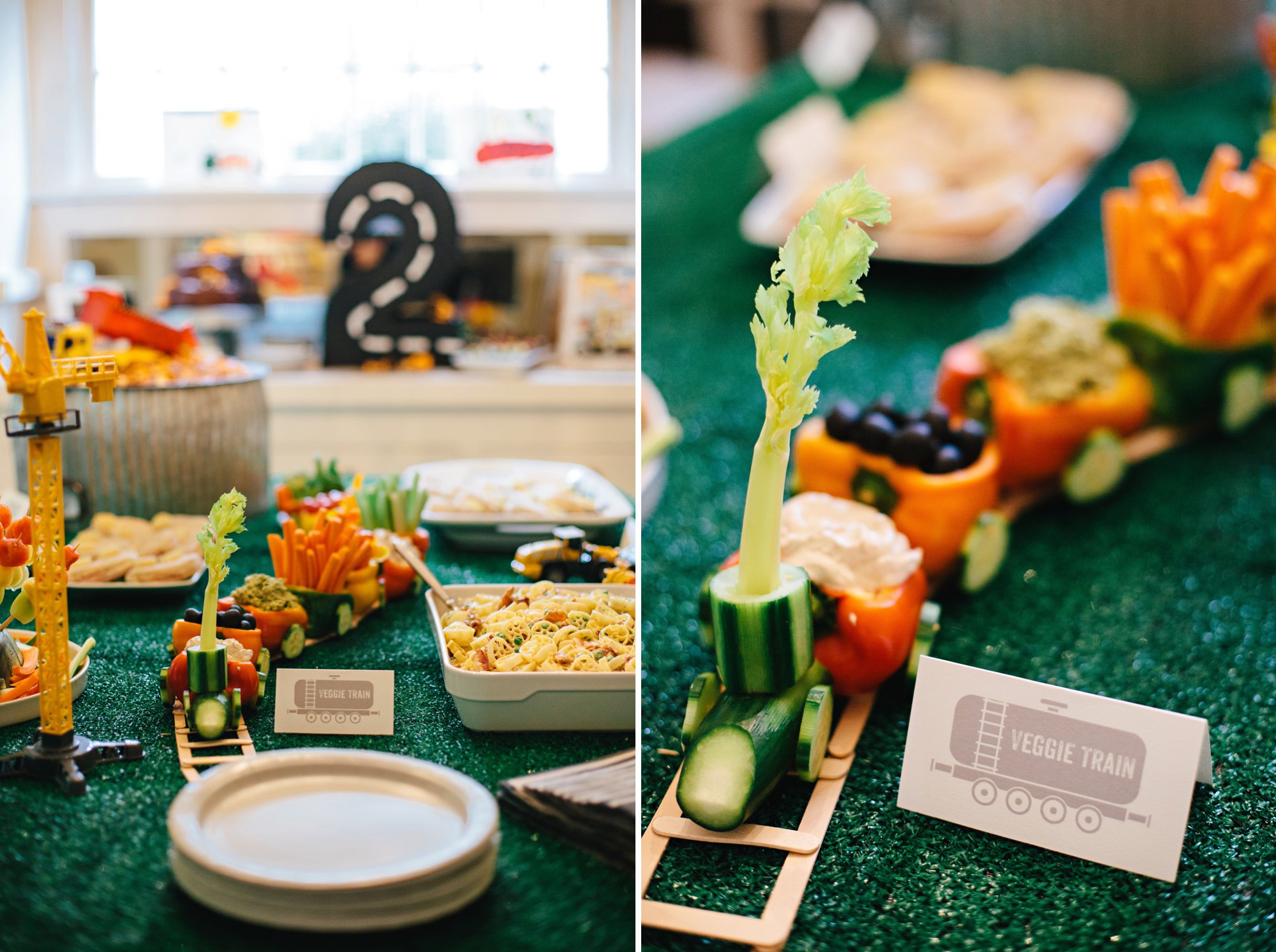 Our veggie train made the perfect centerpiece for the table! I found the idea for the train on Pinterest and it was the very first thing I saved to Cole’s birthday party inspiration board (along with lots of other adorable vehicle-related party ideas!). I adapted the train design slightly and filled the peppers with our favorite veggies, french onion dip, and spinach hummus. Armed with my handy glue gun, I put together this simple train track using popsicle sticks the morning of the party, and it was the perfect spot for the peppers! We used this astroturf rug I found on sale at our local grocery store, as our table cloth. I have a feeling we’ll find plenty of ways to use this rug for future parties and decor.