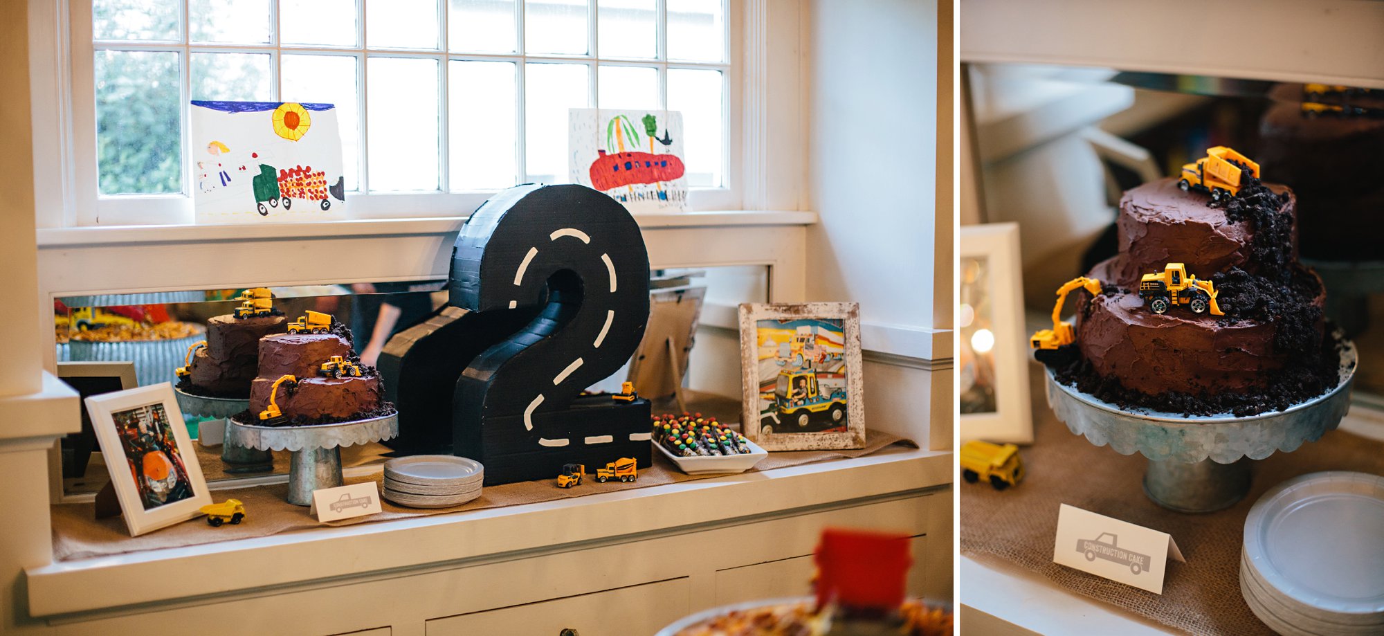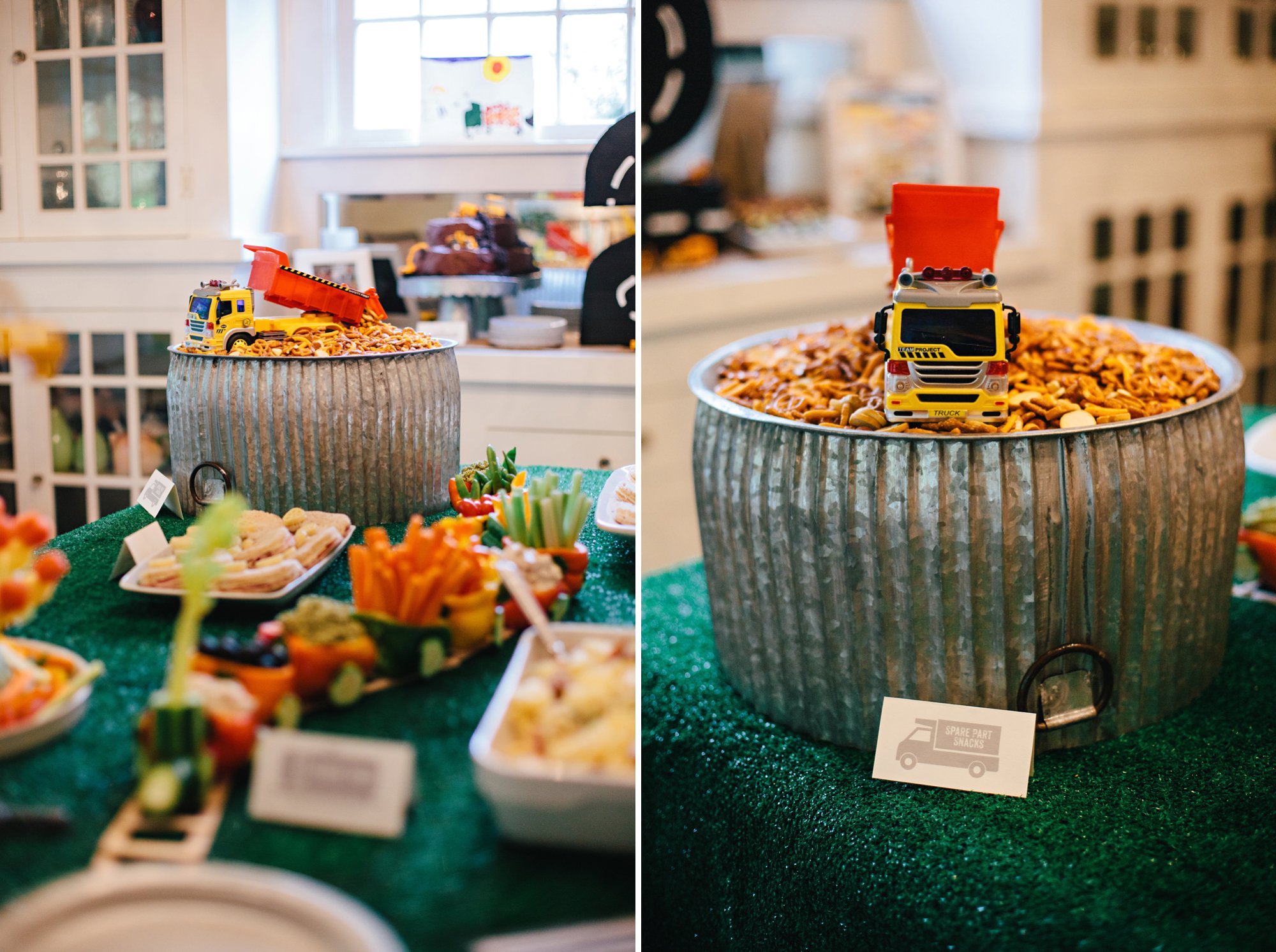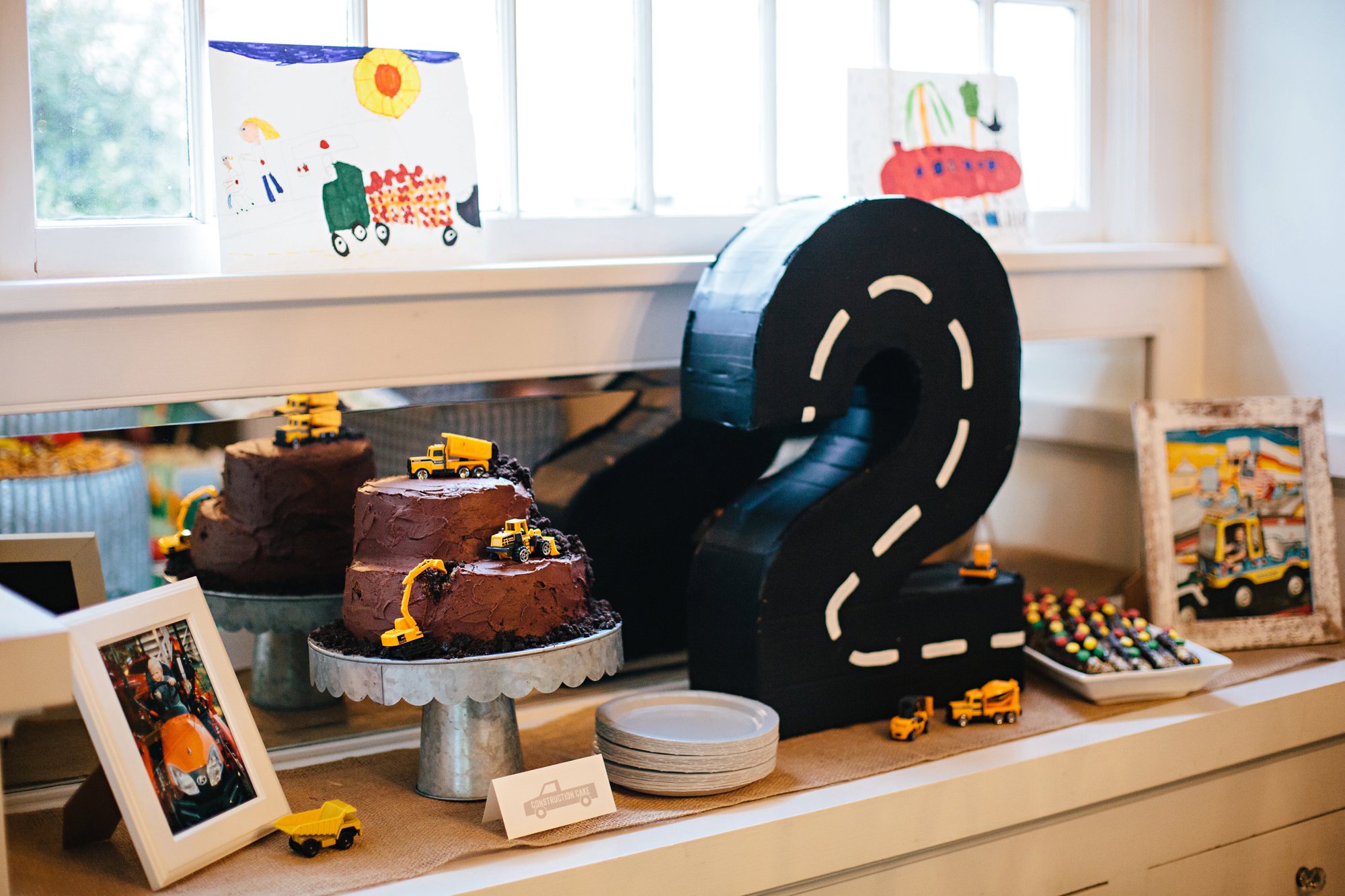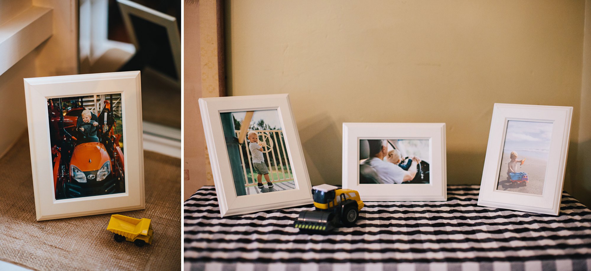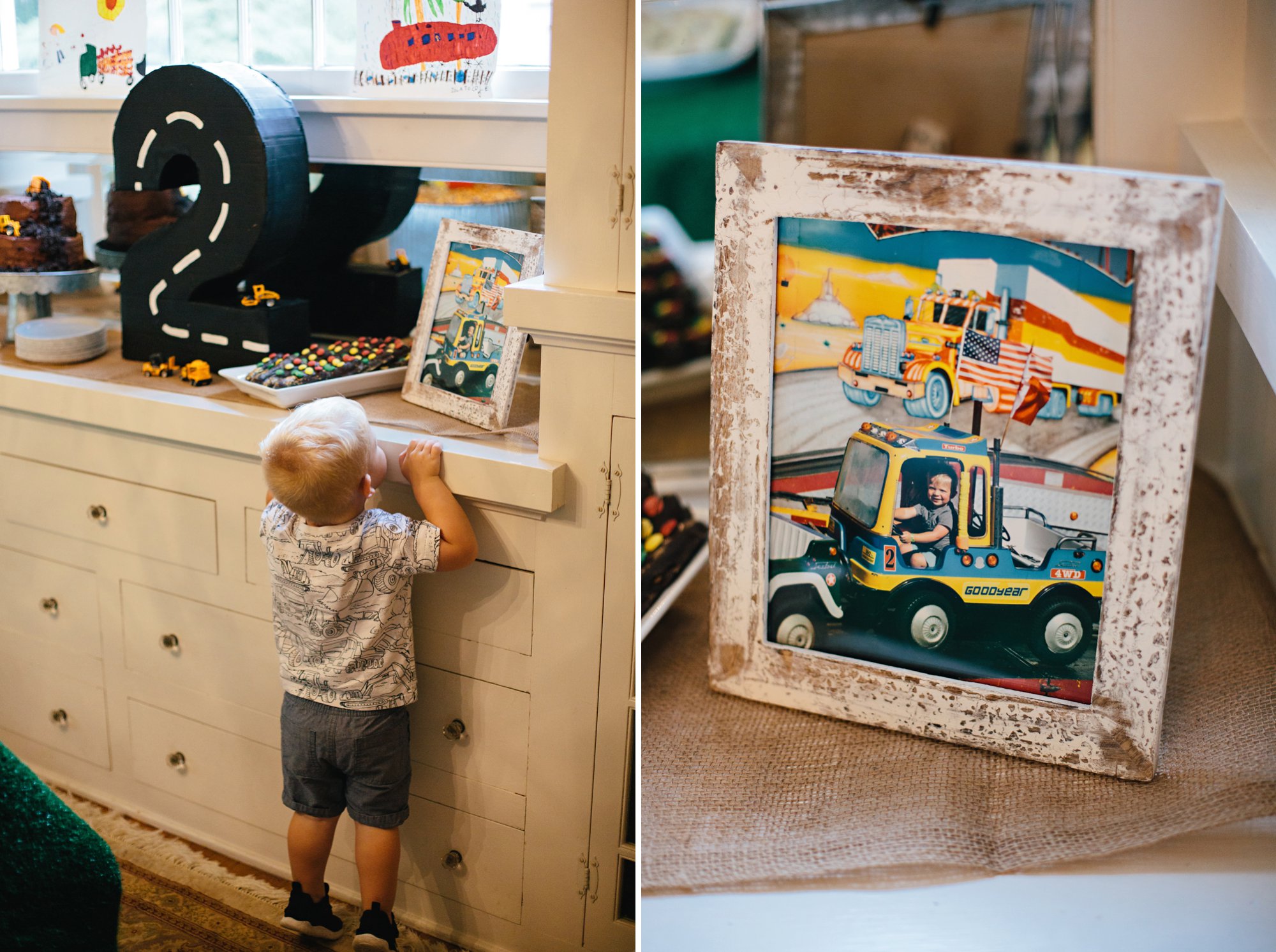 I always like to include framed photos of the birthday boy (or girl) in the decor. We printed a handful of favorites of Cole driving or playing with his favorite vehicles to go with the theme. Not only do the photos add a nostalgic touch, but it is so fun to see our guests smiling as they pause to look at them!