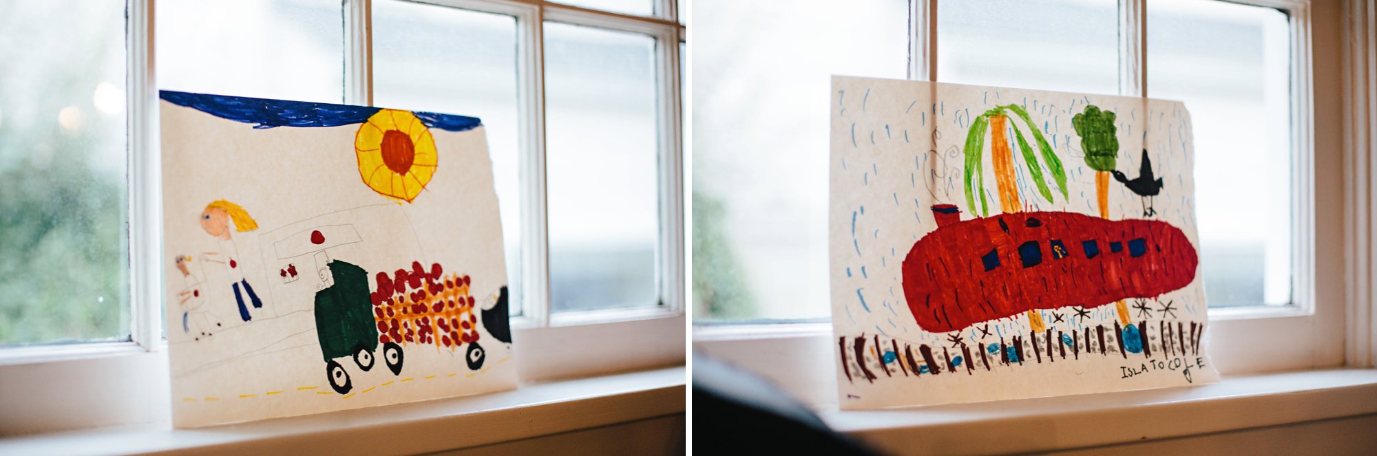 We made sure to incorporate these darling drawings Isle made for Cole in the decor as well. The first is her pushing him in the stroller next to a tractor and the second is a train in the rain.
