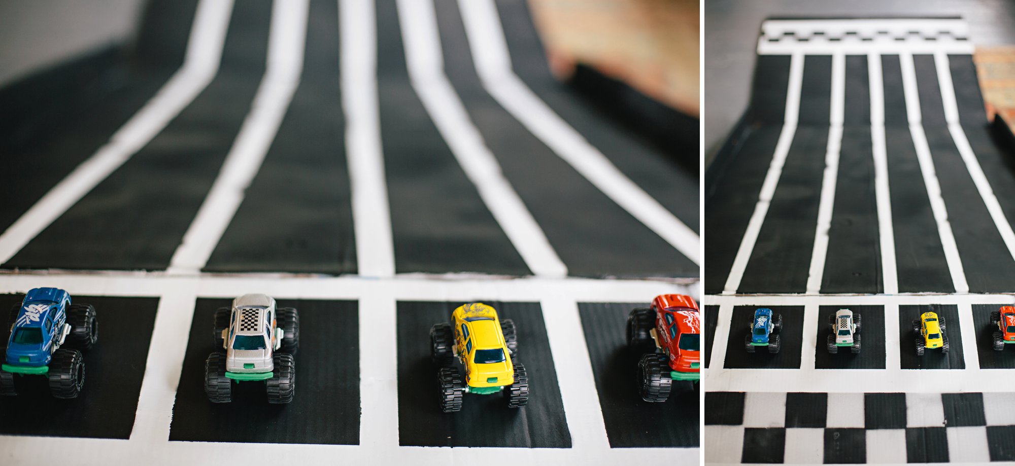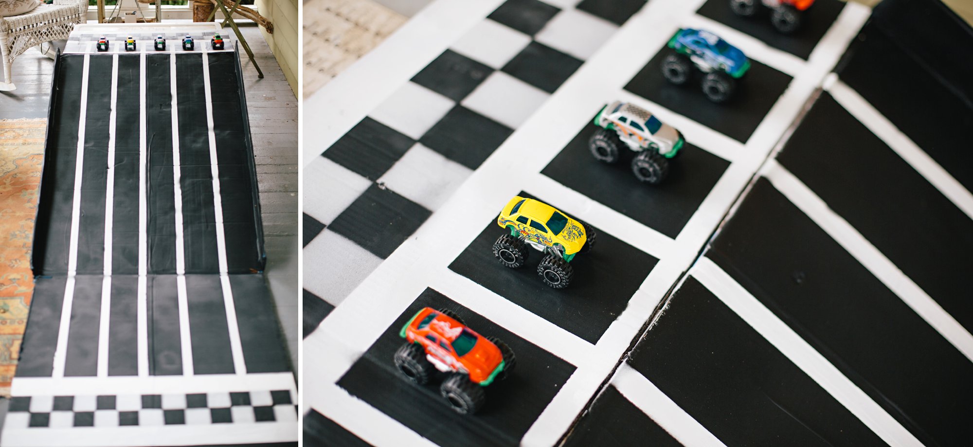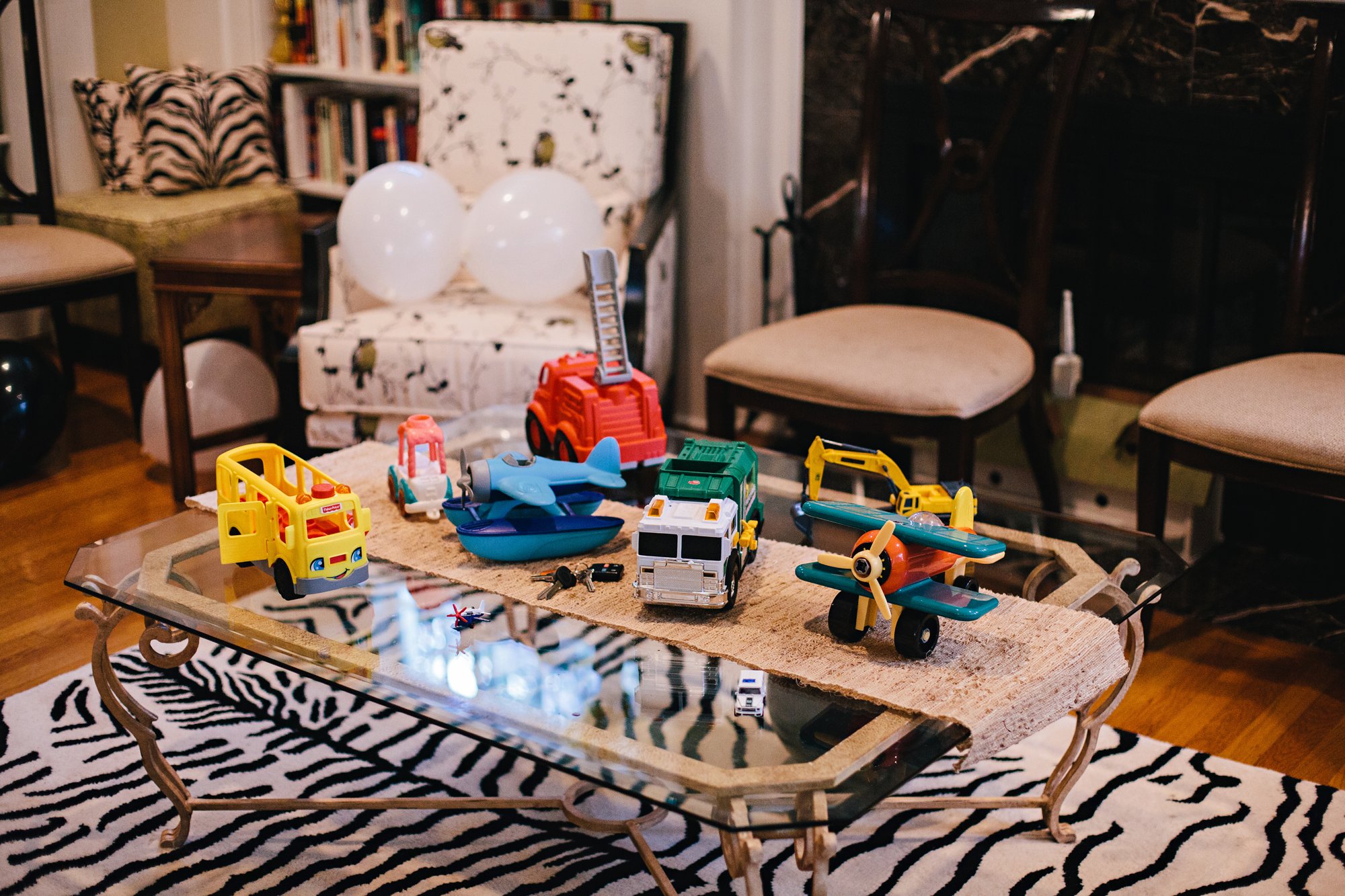 We brought out various vehicle toys from Cole’s room for the kids to enjoy, and also blew up black and white balloons and sprinkled them around the house. Balloons are another great Dollar Store addition that are a must for us at every children’s party– the kiddos always LOVE the balloons and play with them nonstop.