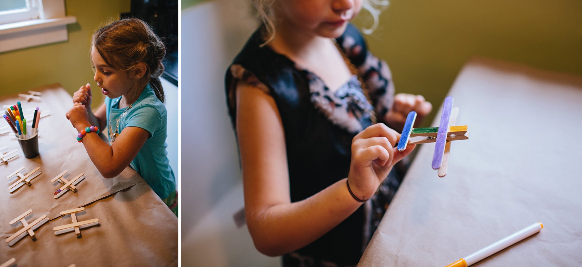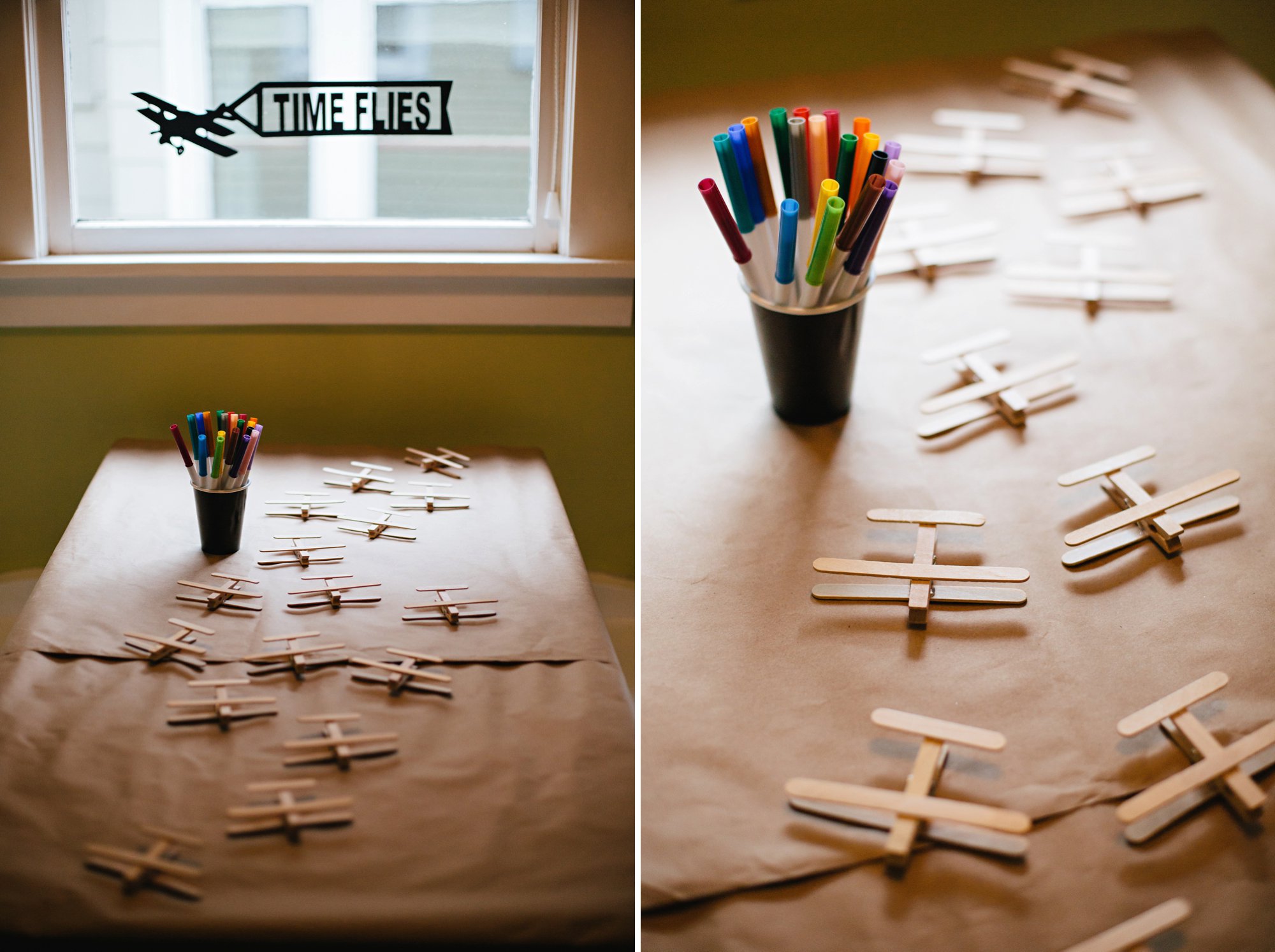 We set up a few simple DIY activities for the kids. The first was a decorate your own airplane station. It took no time at all to make these darling little clothespin and popsicle stick airplanes (thank you, glue gun!). We covered the table with kraft paper, and set out the airplanes and washable markers. The kids went to town creating their own designs!