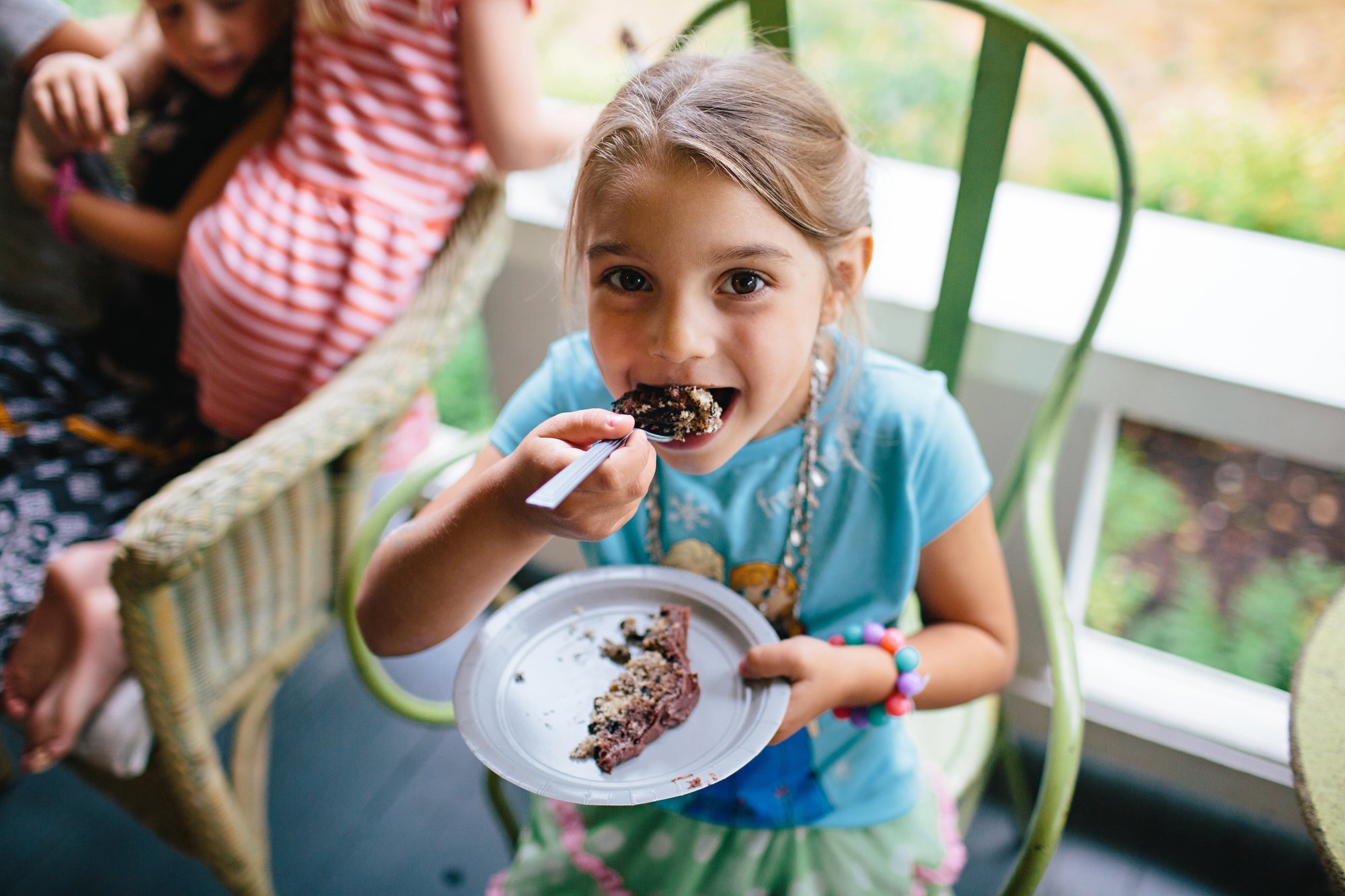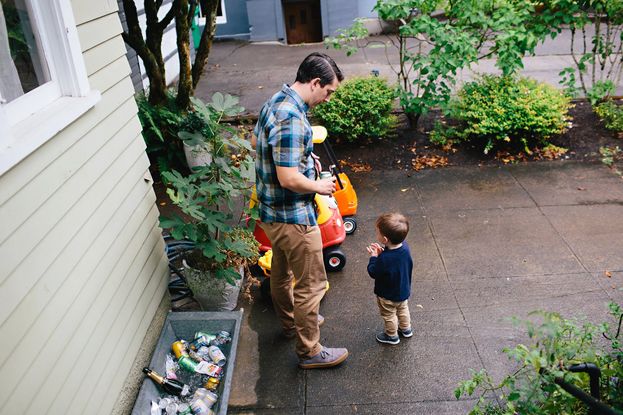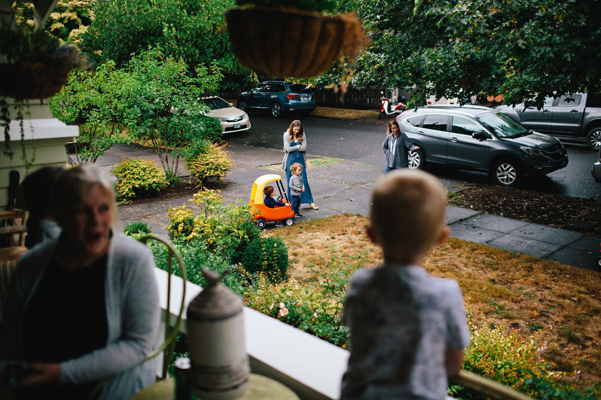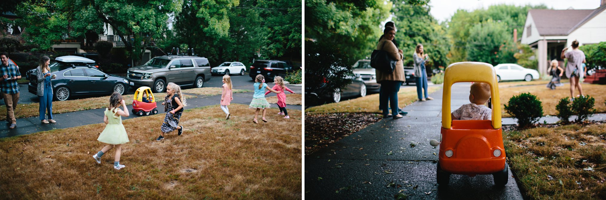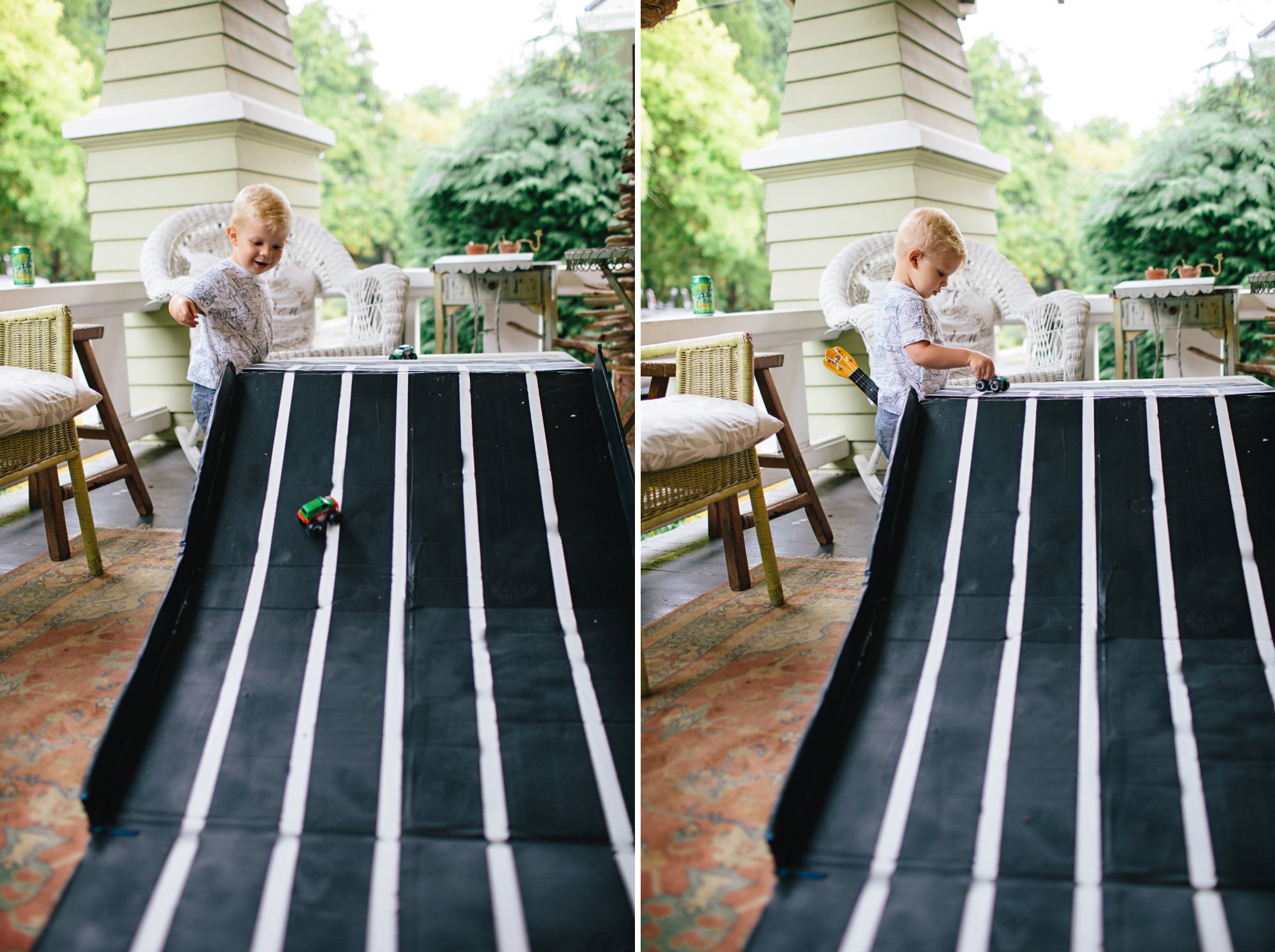 We also set up a little racing ramp. Isaac made the ramp from cardboard and spray paint, and propped it up on a plastic tub. It was so cute hearing the kids giggle as their cars raced down the ramp– and sometimes clear off the porch!