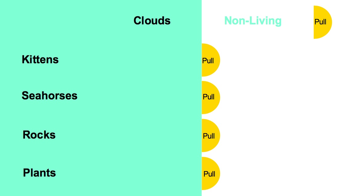 I would point to one of the objects and ask a student if it was living or non-living.  The student would then answer and support their response by explaining how they knew.  For example, “Yes, a kitten is a living thing because it moves, it eats, it removes waste (it poops- haha!), it breathes air, and it can feel things.”  Once they finished their response they’d get to walk up to the board and “pull” the tab and the correct answer would be revealed.  All their classmates would cheer and clap.  It was great fun!