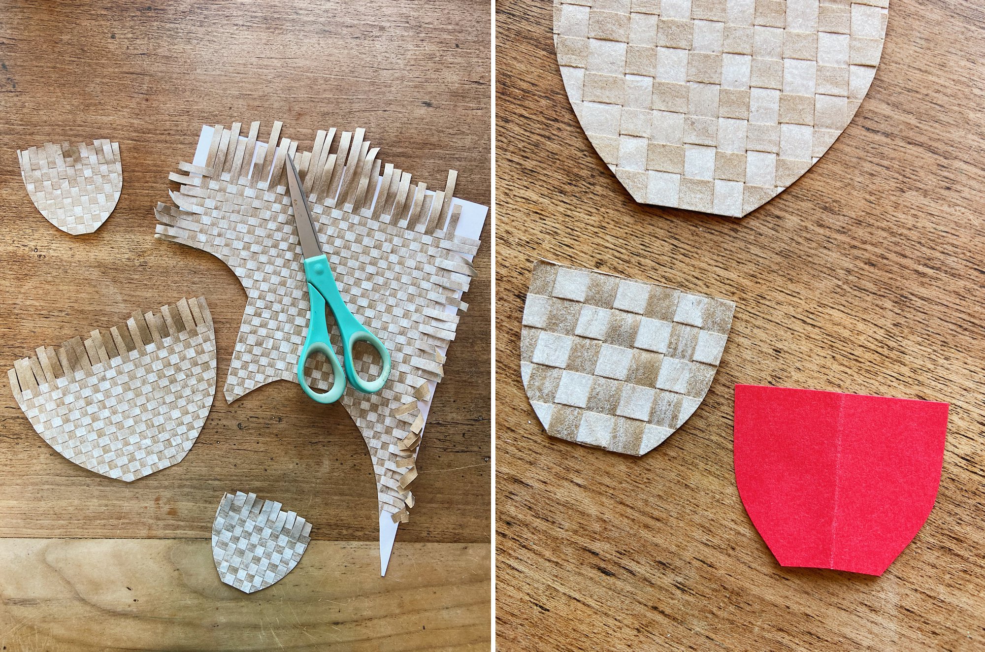 The red shape is the basket stencil we made from a sheet of scrap paper. We cut it down even smaller at the end so that we could cut a few teeny baskets from the leftover paper weaving scraps.