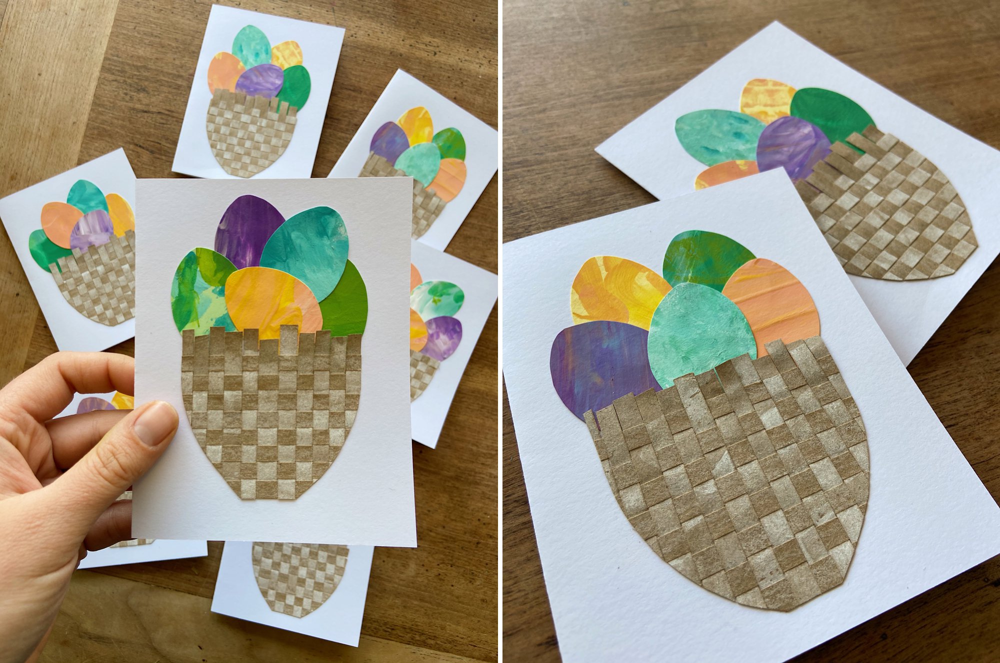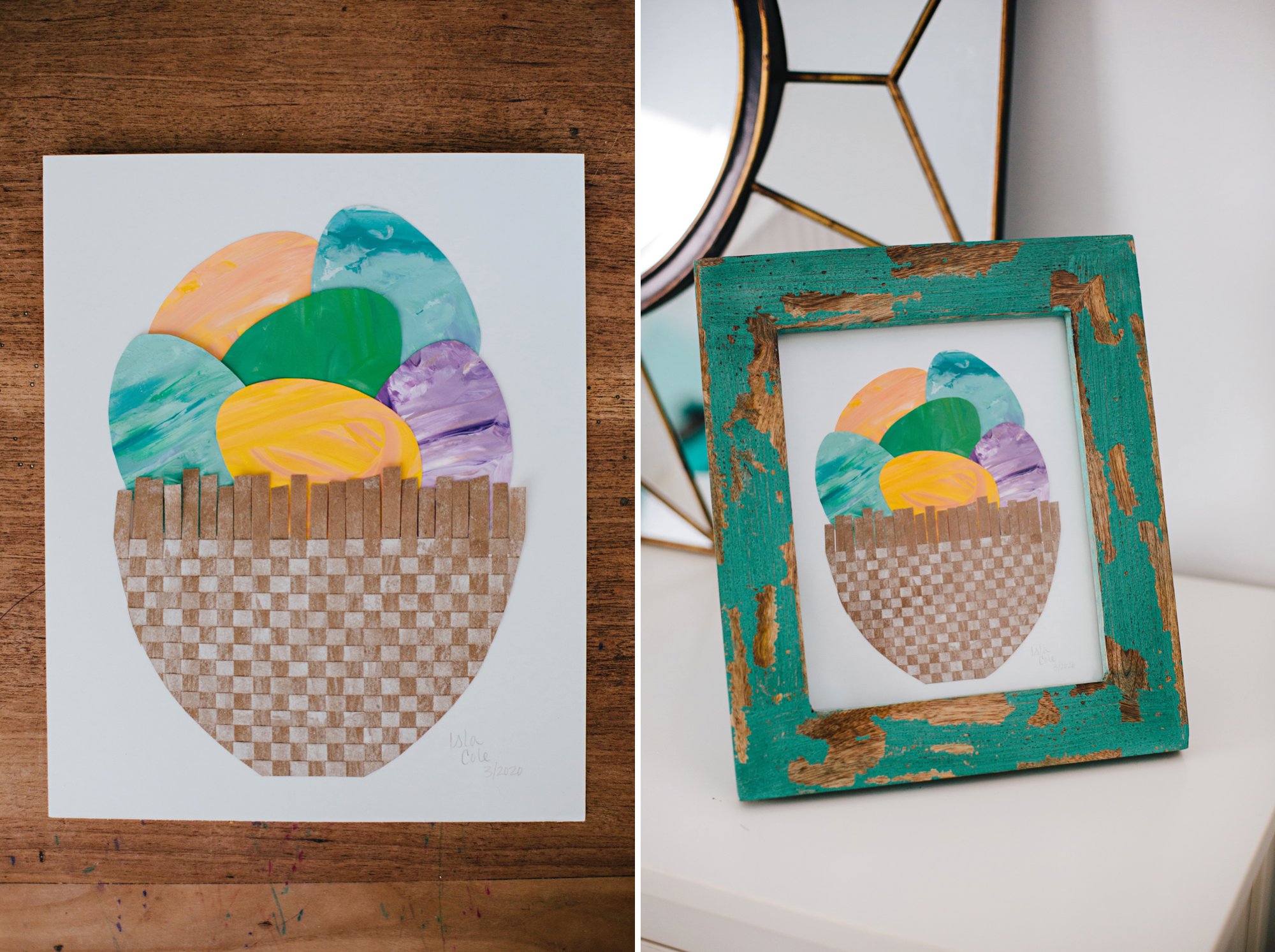 We transformed one of Isla’s paper weaving projects into the sweetest white-washed baskets and cut out Cole’s paintings into festive eggs. We made one large 8×10 piece to frame for our house and 7 greeting cards to send to family!
