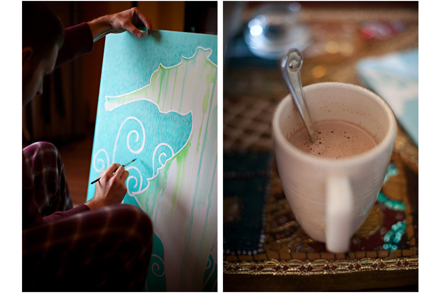 Warm jammies all day… sipping coffee and cocoa… curled up on the couch together working on creative interests…perfection.