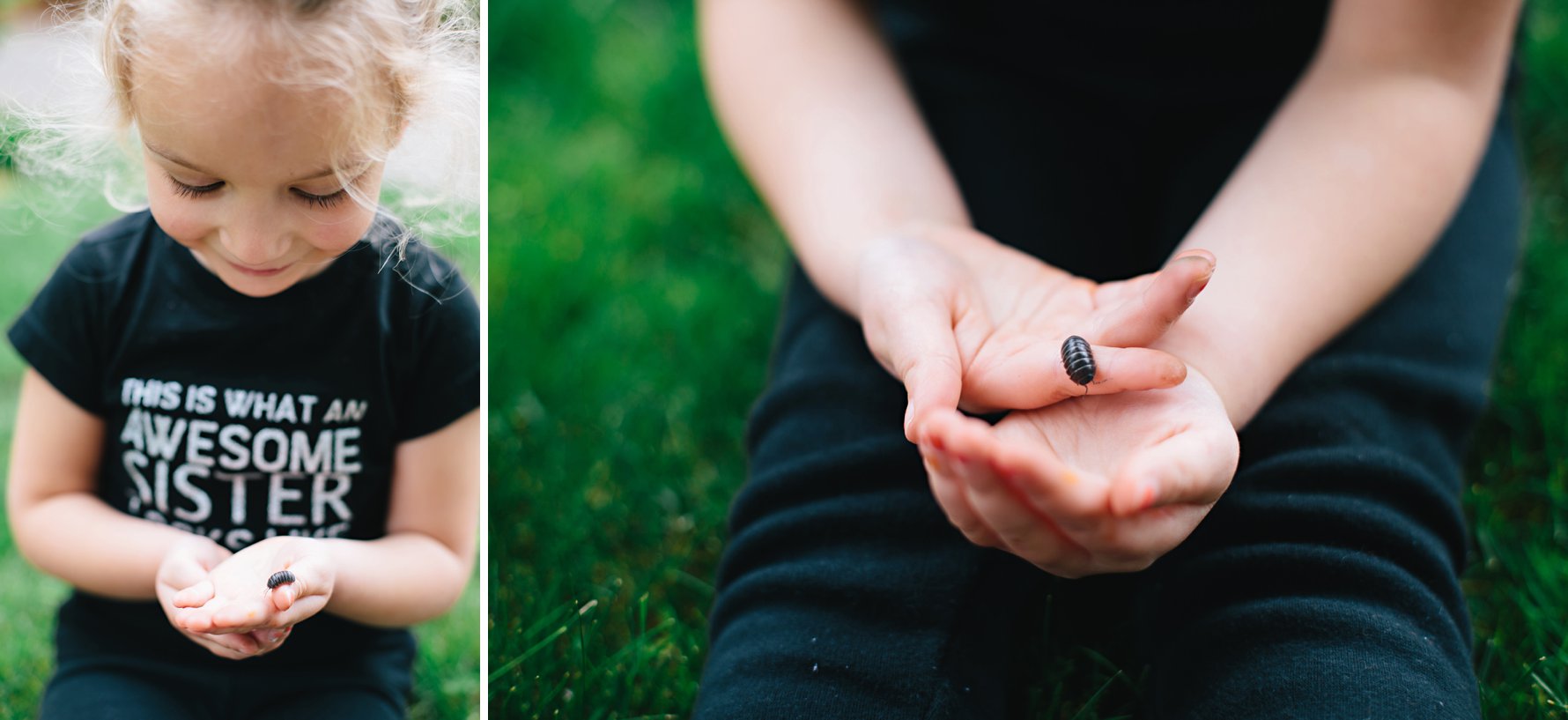 Isla was absolutely enamored with the story about Roly Poly, so she was thrilled to discover one when we were pulling weeds the other day. Being quite the cautious little bug, it stayed rolled tightly in a ball for a long time, inspiring Isla to name it Little Scaredy. She patiently waited for Little Scaredy to unroll, and then giggled like crazy as its tiny feet tickled her hands.