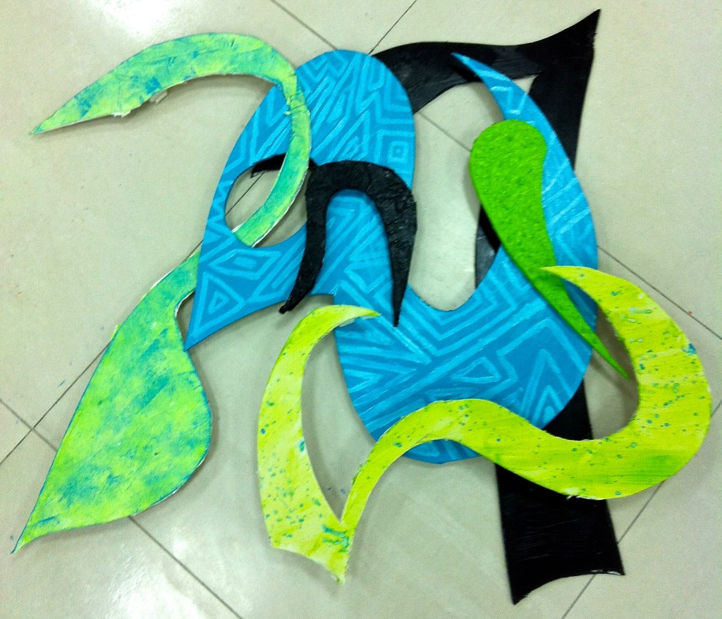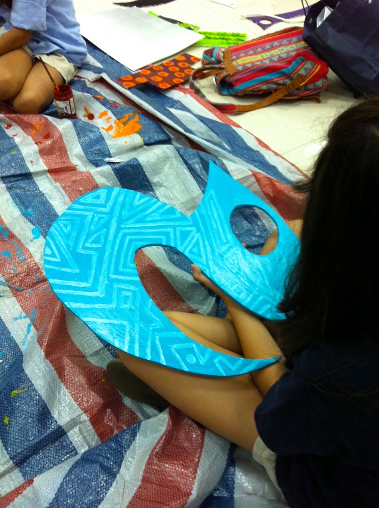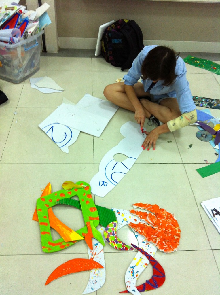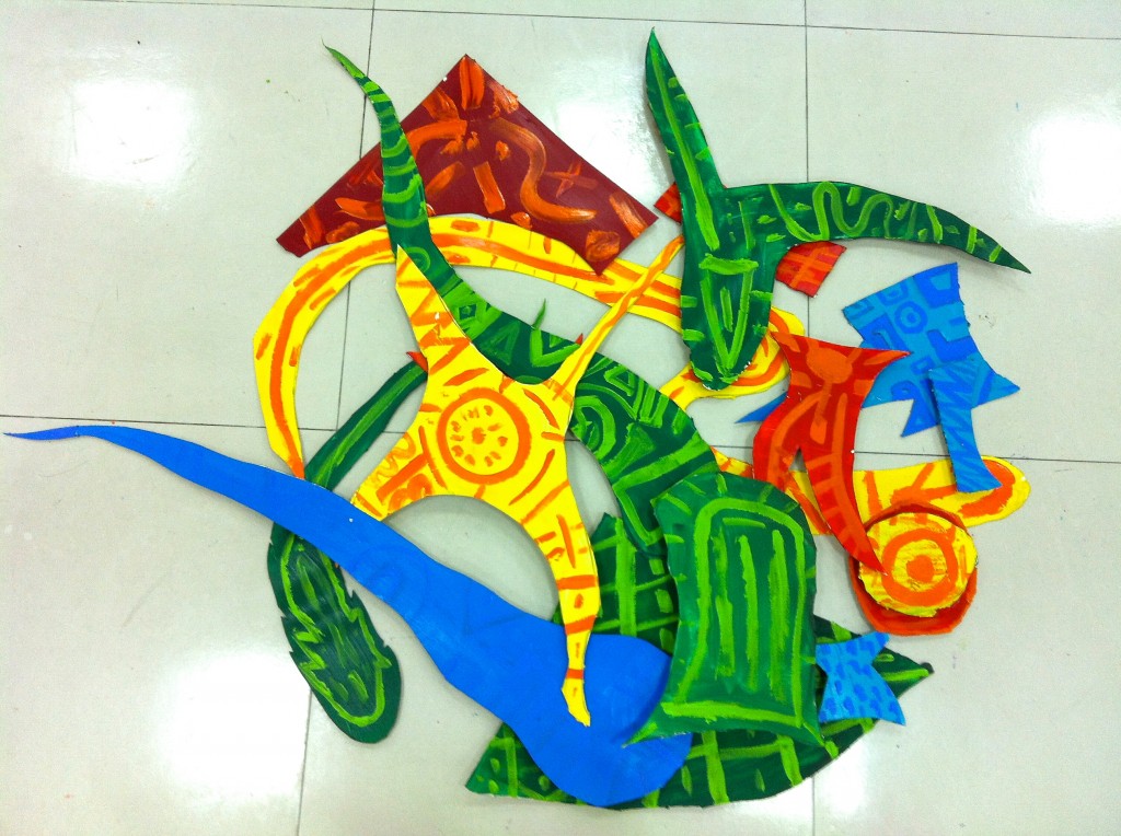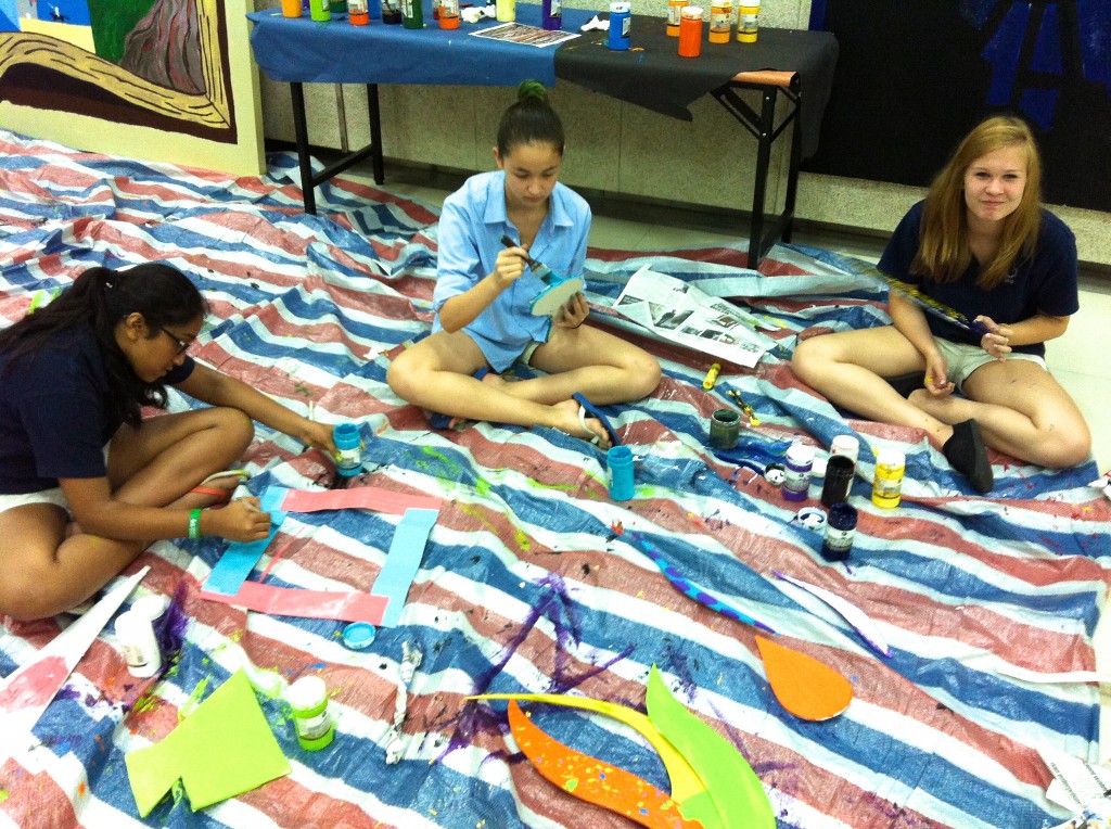 The new art room was still under construction, and this project required a large amount of room for production. So, we moved our efforts down to the basement and took over the full space for the last month of school. We did our best to keep the mess under control… but it was near impossible to keep paint and glue off the floor and maintain an orderly pile of scraps under the stairwell.