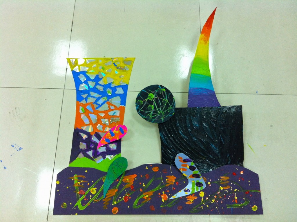 Love the use of texture in this project… the picture here doesn’t do it any justice. The artist used broken pieces of cd’s and various methods of mark making with acrylic paint throughout for a dramatic feel. The scene looks like what Stella would have come up with if he had created a piece based on the city of Shanghai.