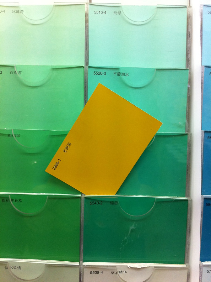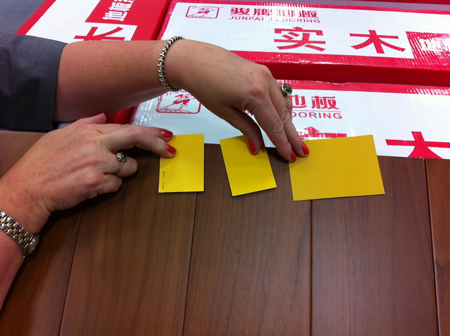 Mustard is a tricky color. There’s a very fine line between a rich, chic mustard and “school bus yellow,” as mom calls it. We put our paint chips under several tests. We compared them to our approximate flooring color…