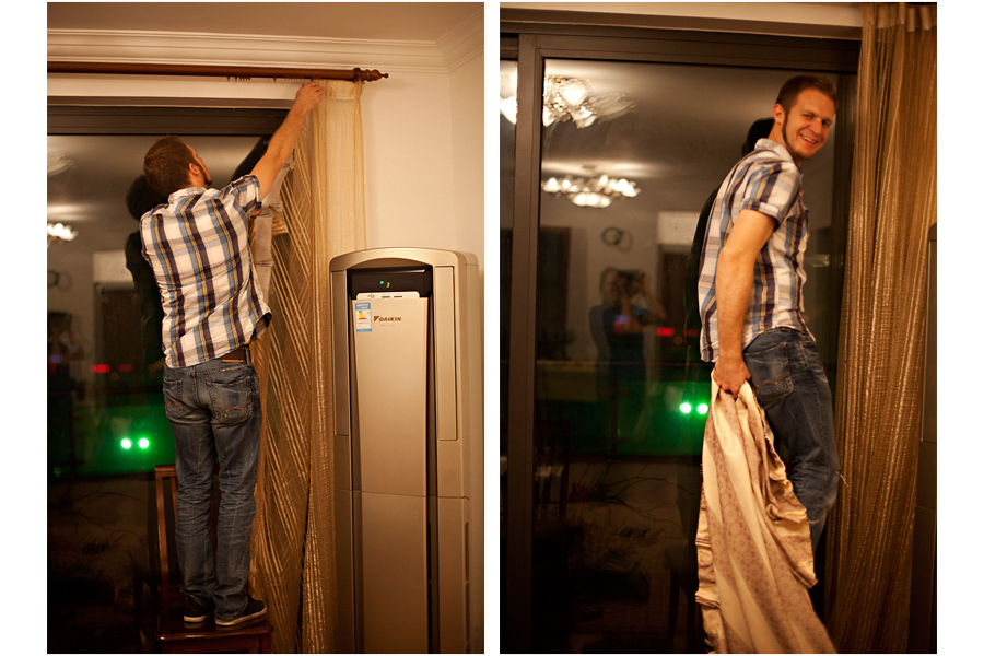 Eventually, we selected a winner, collected all the necessary supplies and headed for home. While it was pretty late in the evening at this point, Isaac was itching to start the transformation. At a minimum, he decided that we could stare at our hideous curtains no longer! Here he shows you what they should be used for… =)