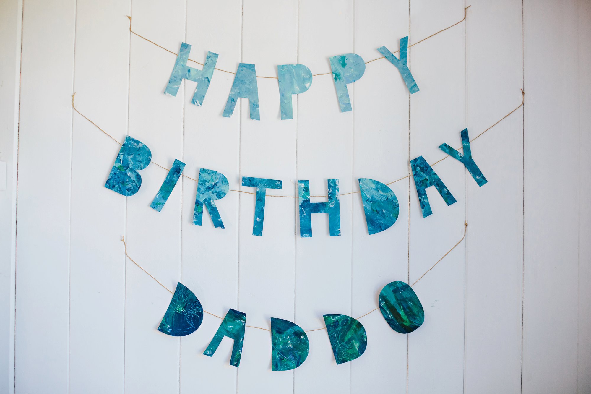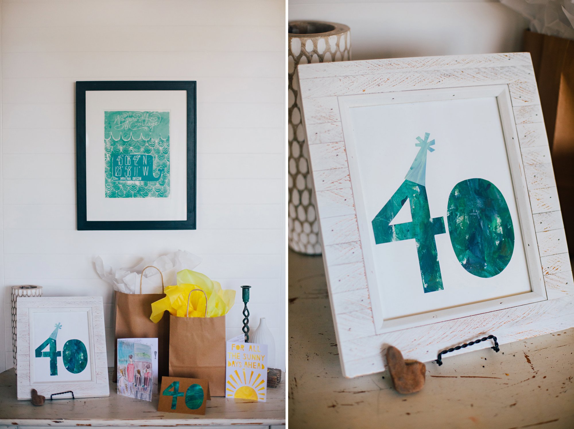 Birthdays call for festive decor in our family, and the kids and I had so much fun making this beachy banner for Isaac! Isla and Cole painted sheets of paper in ocean hues and I just love how they turned out! To maintain consistency with our decor, we also used some of the leftover paintings for a spunky little 40 (complete with party hat) and Cole’s card for Isaac.