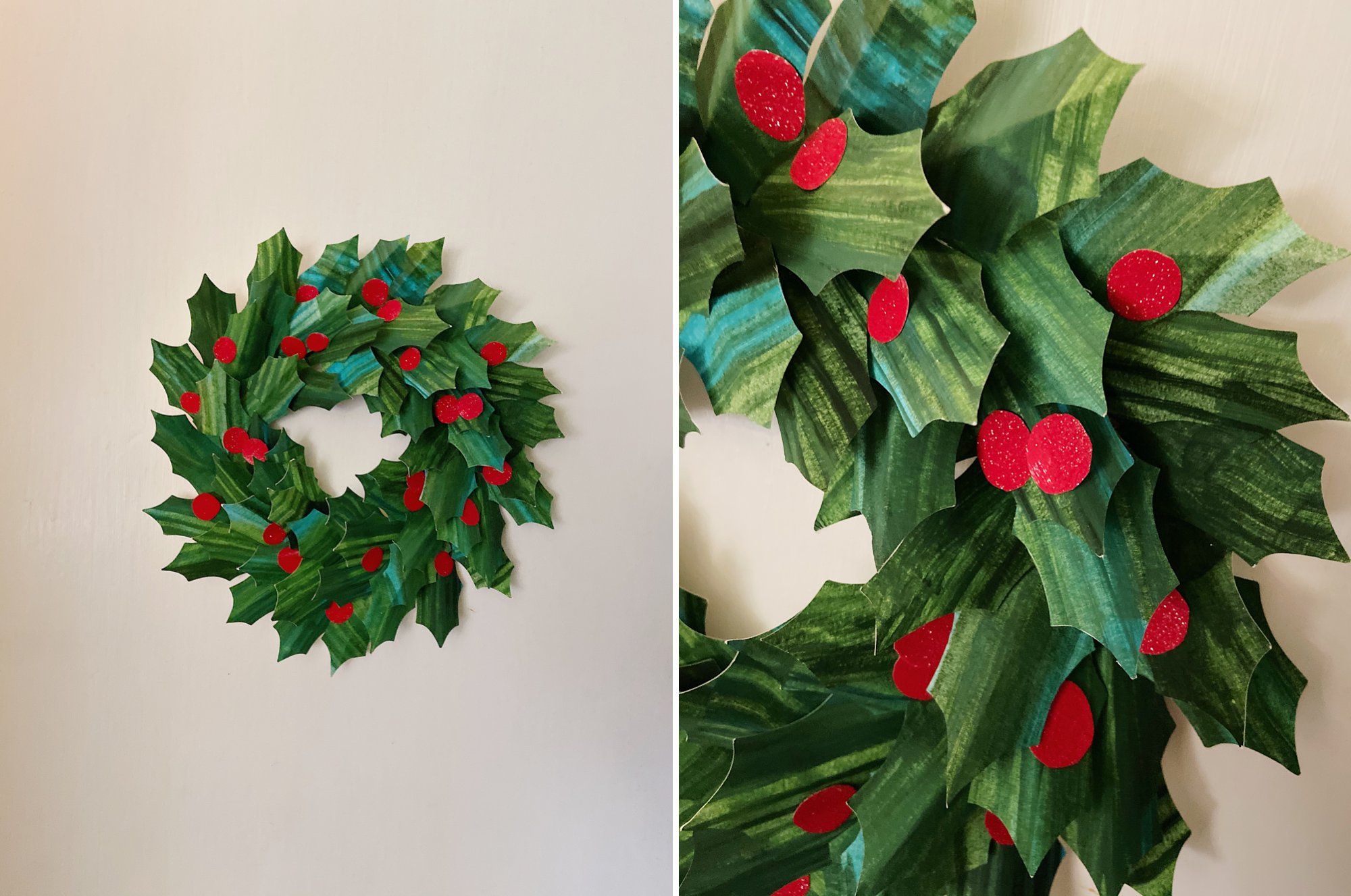 Inspired by @amandamcgeedesigns, Isla and I made a plan to create our own wreath and set to work. First, she swipe painted several sheets of sturdy watercolor paper using acrylic paints. When the paintings dried, I cut out holly leaves using my Silhouette Cameo. Then I painted another sheet of watercolor paper with red acrylic and sprinkled a fine red glitter onto the paint while it was still wet. Once that had dried I hand cut round berry shapes. To assemble the wreath I used my trusty glue gun and attached the holly leaves to a cardboard ring. It took some playing to get the leaves where I wanted them— it was definitely a “learn as you go” experience. Then I used a little liquid glue to add the berries.