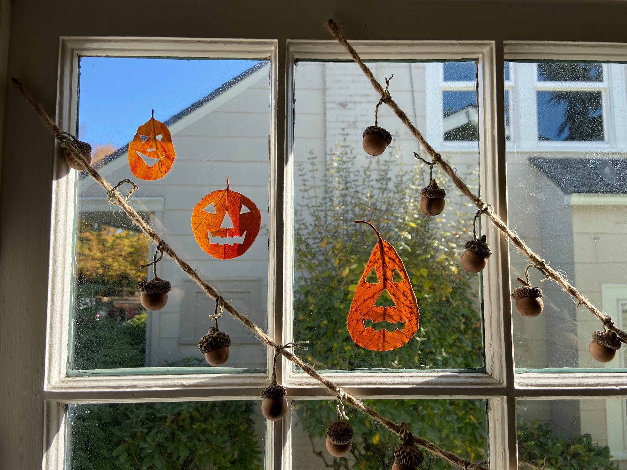 These jack-o-lanterns are a wonderfully simple seasonal craft we just learned about from a new friend. When Cole and I were on our morning walk last week we met the sweetest woman named Mary. She saw Cole playing in the leaves and came outside to say hello. Mary has lived in her beautiful home for forty years and has always loved the fall leaves in our neighborhood. She told us that every year she collects and cuts leaves to look like little jack-o-lanterns. Then she presses them and hangs them up around her home. How sweet is that?! We are grateful to have met Mary and love that every time we look at these jack-o-lanterns we will be reminded of the lovely people in our neighborhood!