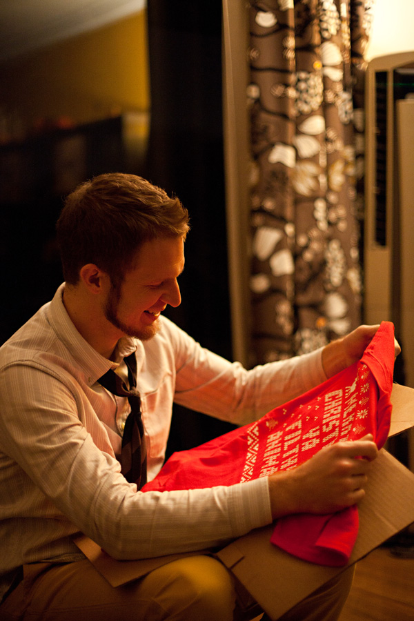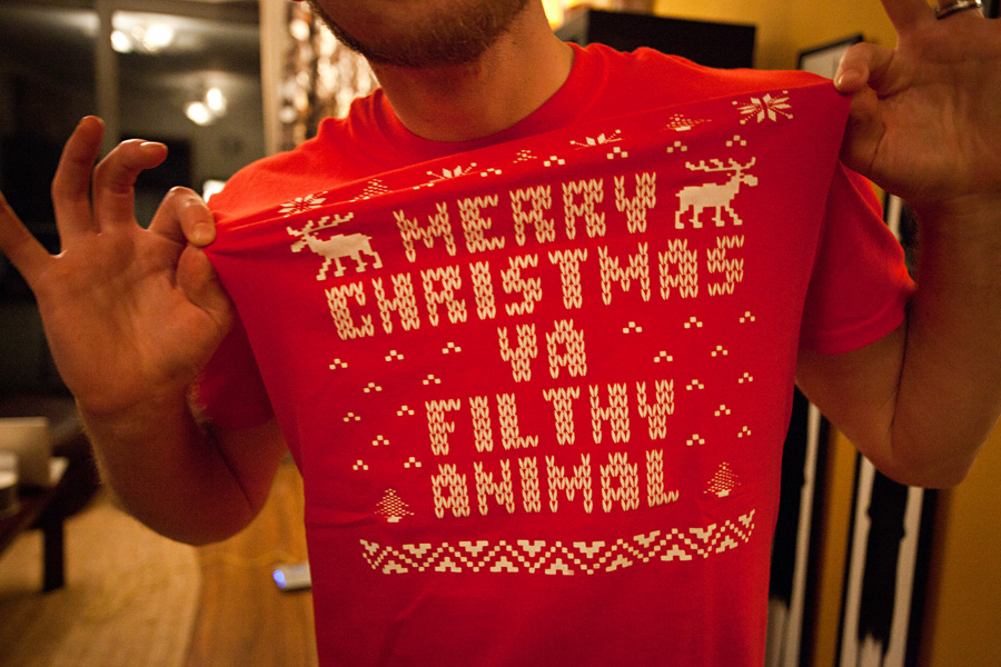 Every year after we’ve stuffed ourselves with our turkey feast on Thanksgiving, we curl up and fight off our food coma long enough to watch our first annual showing of Home Alone. It’s our Christmas kick-off tradition. Last year I decided to add to the tradition and get us new Christmas jammies, to be opened and worn before movie viewing. You may remember last year’s silk disappointments. Yeah, those didn’t last. I made sure to plan ahead this year, and had super soft flannel jammies made… and they are oh, so snuggly! To complete the ensemble I found these hilarious ugly sweater t-shirts paying homage to Home Alone- perfect!
