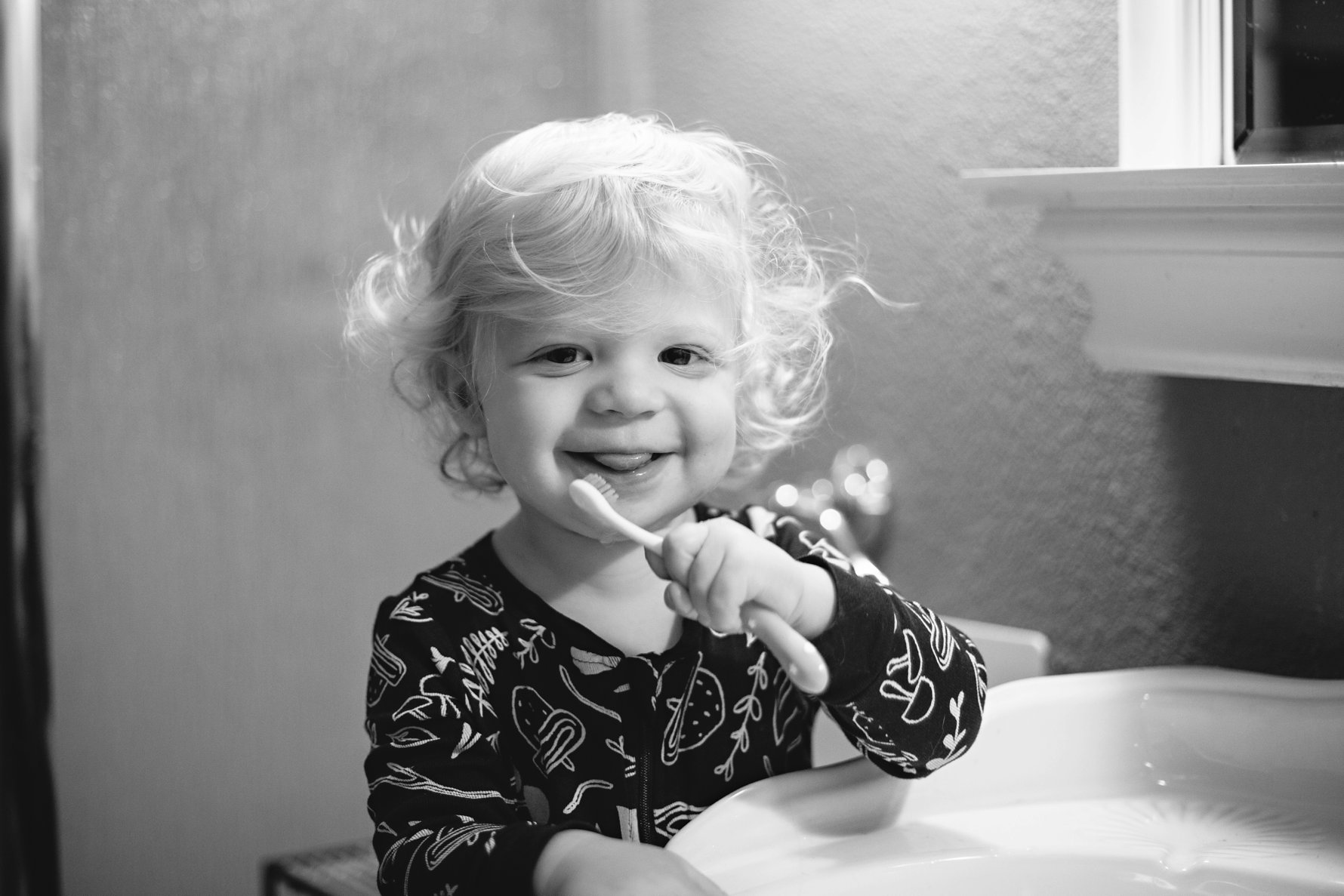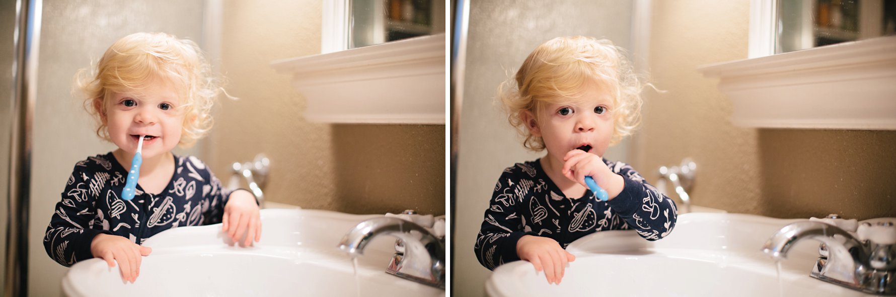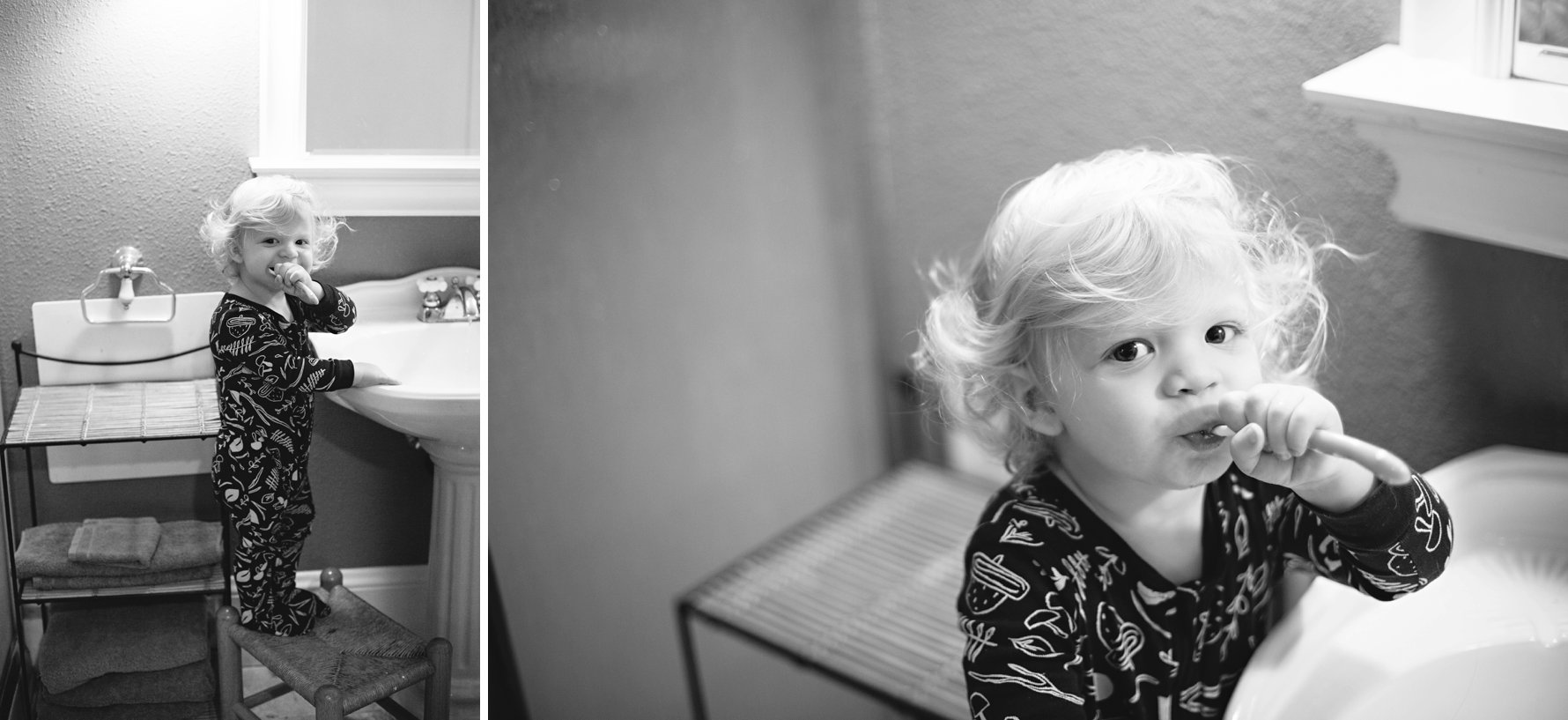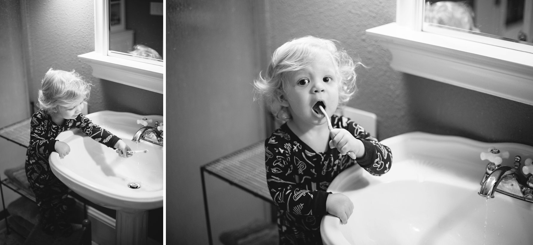 Then he toddles into the bathroom and asks, “Chair?” as he begins to scoot the stool over to the sink. He clamors on, clutching the edge of the basin for balance, eagerly awaiting his cherished routine.