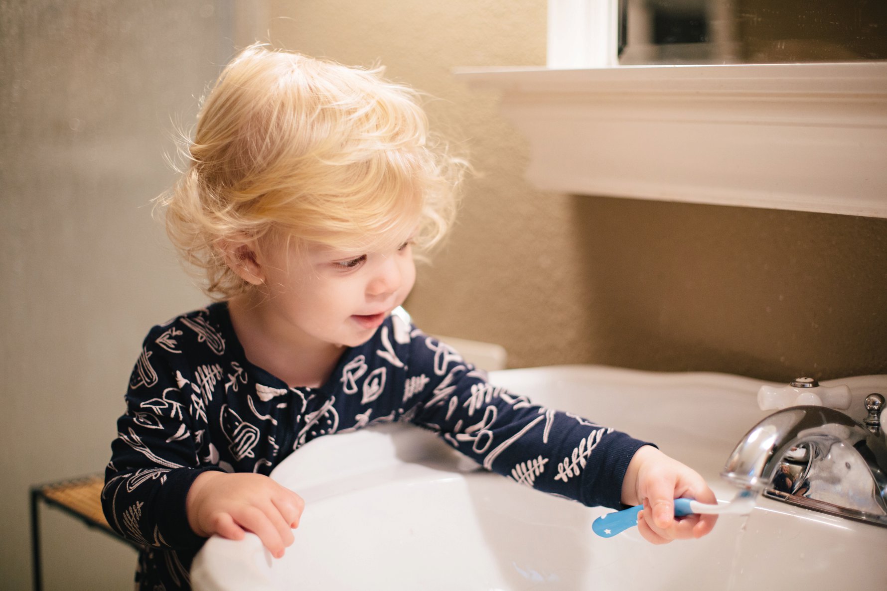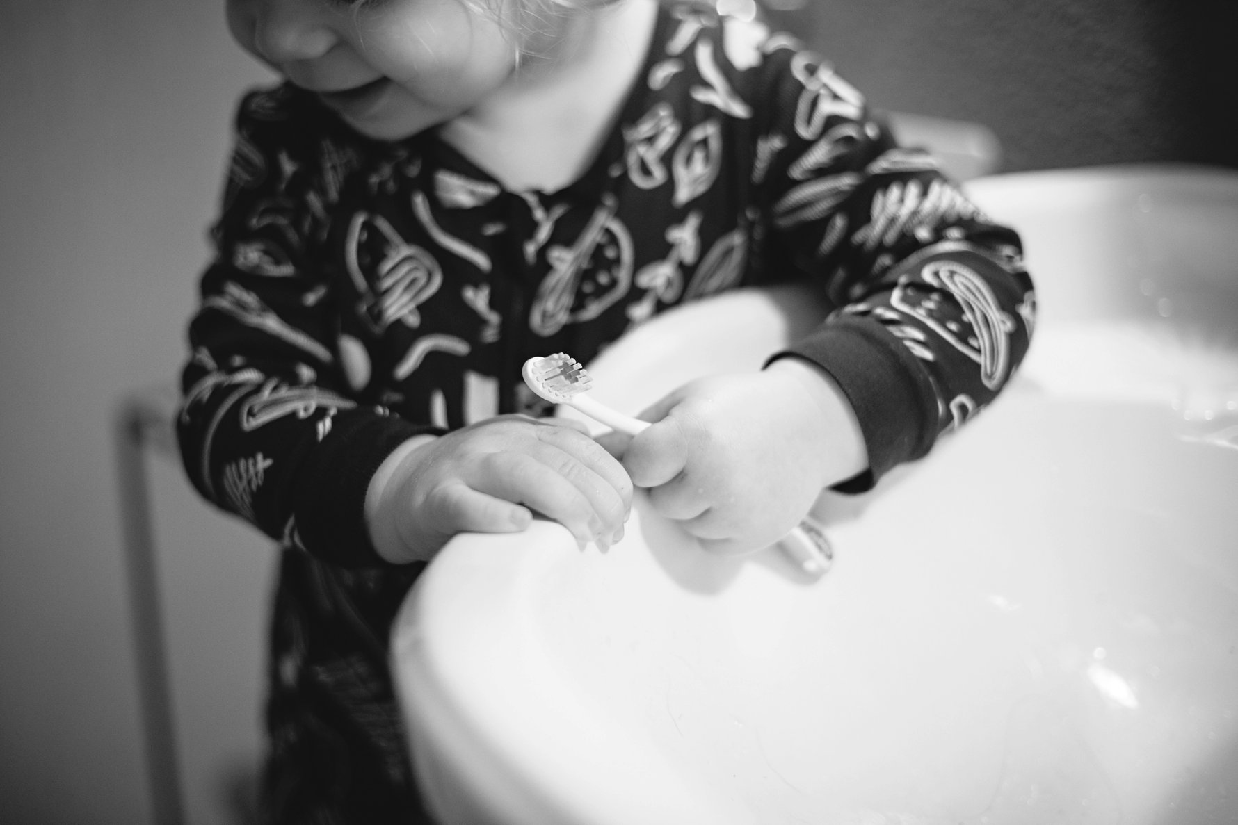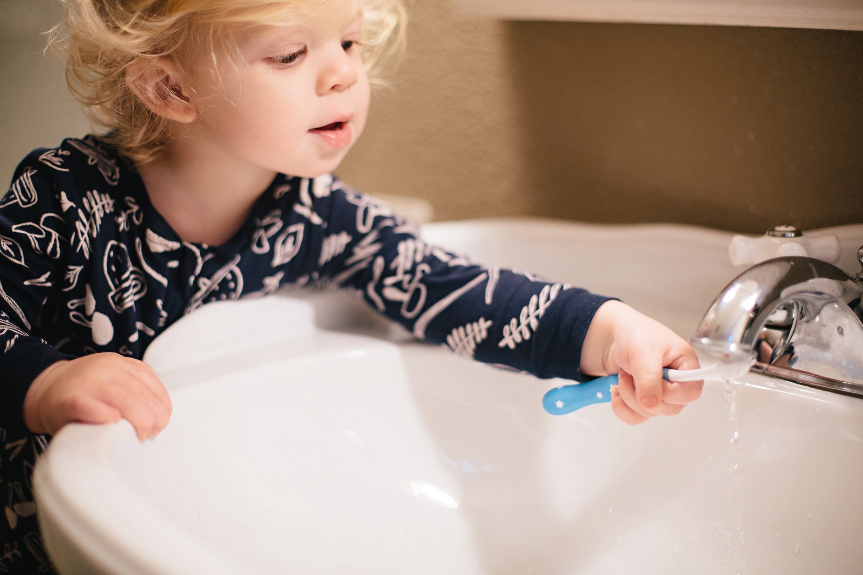 We hand him his tooth brush, turn the water on a tiny trickle and let him brush away. It’s mostly just him putting the toothbrush in the water and then sucking all the water off, but hey, it keeps him entertained far longer than his usual 30-second attention span, so we’re all for it!