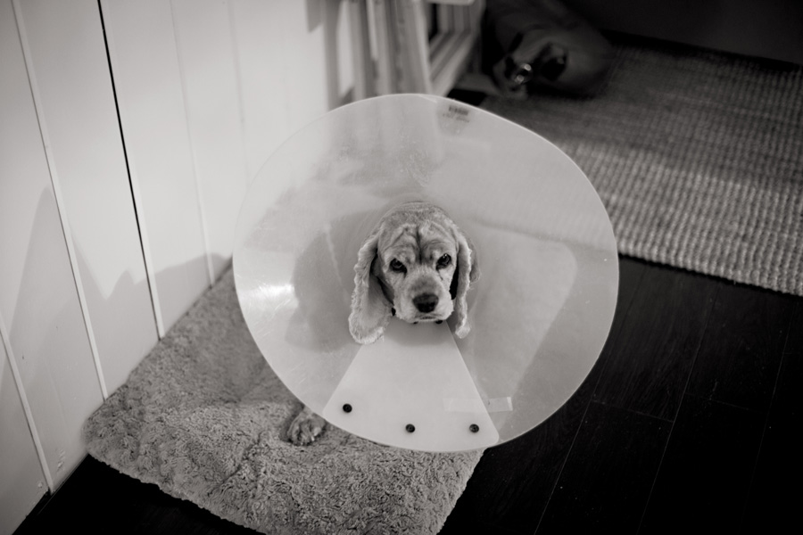 Poor Bella had to wear an e-collar because she kept trying to lick at a cyst on her foot. She actually didn’t mind the collar at all, and pranced around the house whenever we put it on her (she’s actually not unhappy in the above photo- this is her “I’m SO tired!” face.)