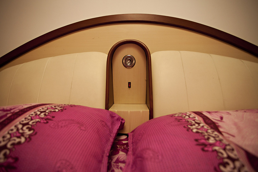The headboard has pleather-faced storage, and a light fixture. It’s so ugly it’s kind of awesome. Check it out…