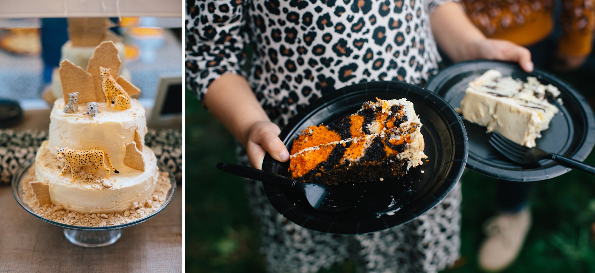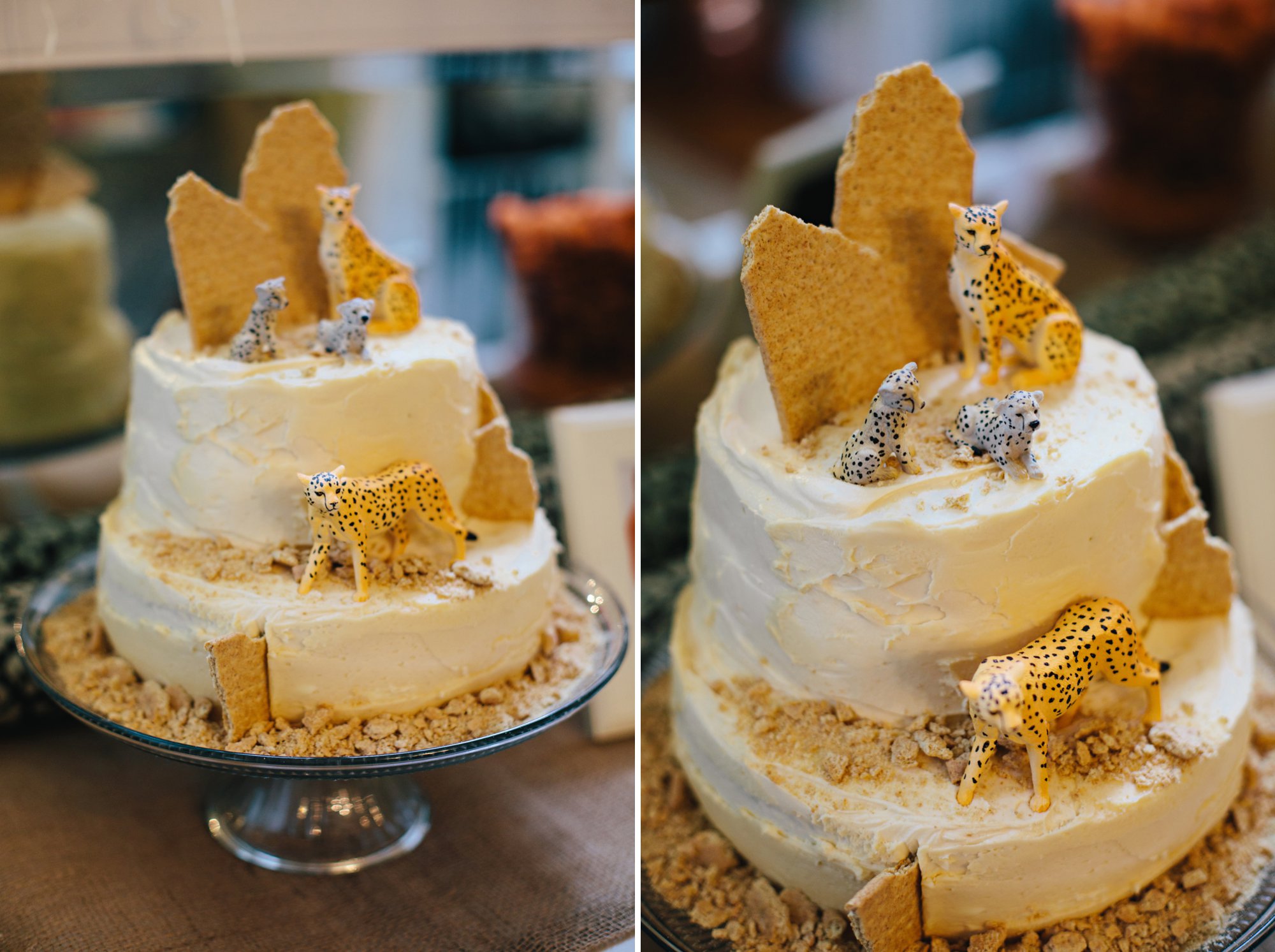 I had so much fun making Isla’s big cat birthday cake and found the BEST tutorials for creating tiger stripe and leopard print cakes! The patterns were surprisingly easy to make. I used a simple vanilla cake mix and food coloring, whipped up a homemade caramel frosting, and sprinkled mini chocolate chips between the layers. Lastly, I topped the cake with graham crackers and this sweet little cheetah family.