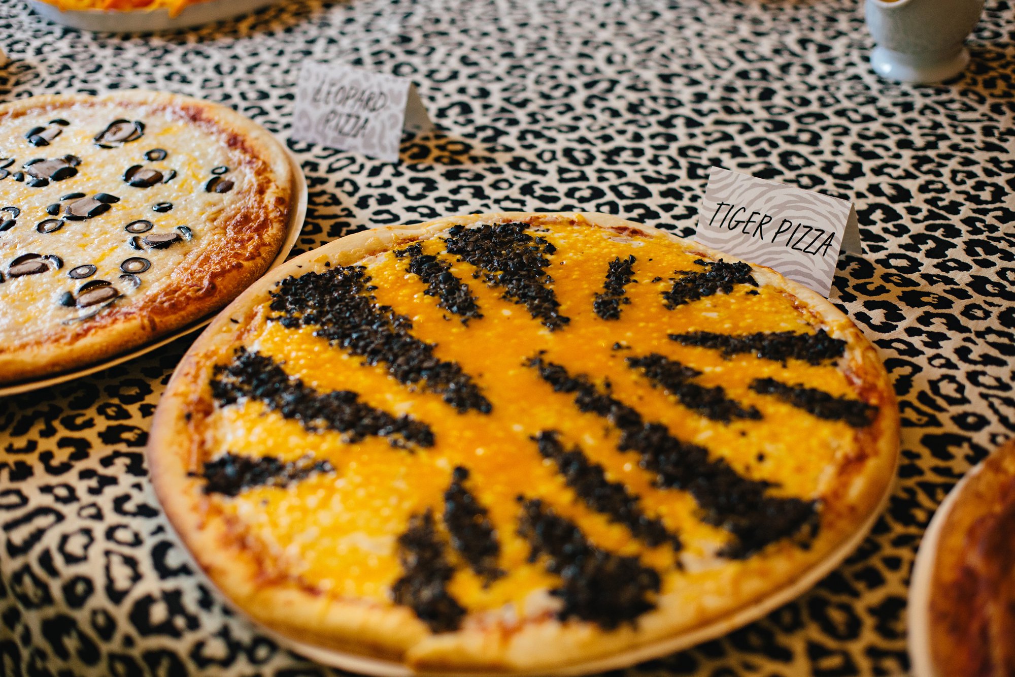 We ordered 8 take and bake cheese pizzas and I decorated each to look like the patterns of different cats’ coats– tiny pepperonis for the cheetah pizza, minced olive stripes for the tiger pizza, mushrooms and olives for the leopard pizza, and I left a few plain cheese for the lion pizza.