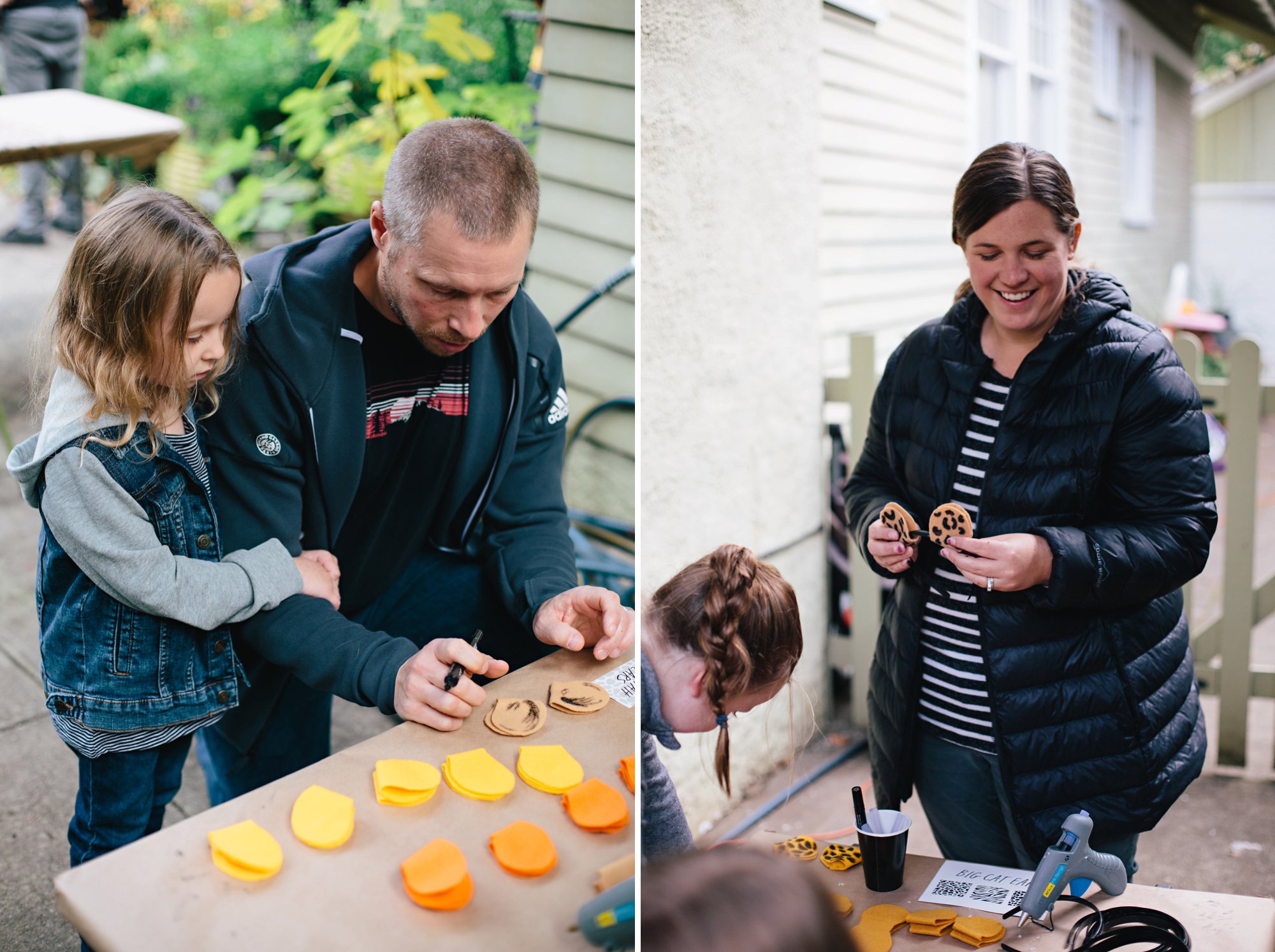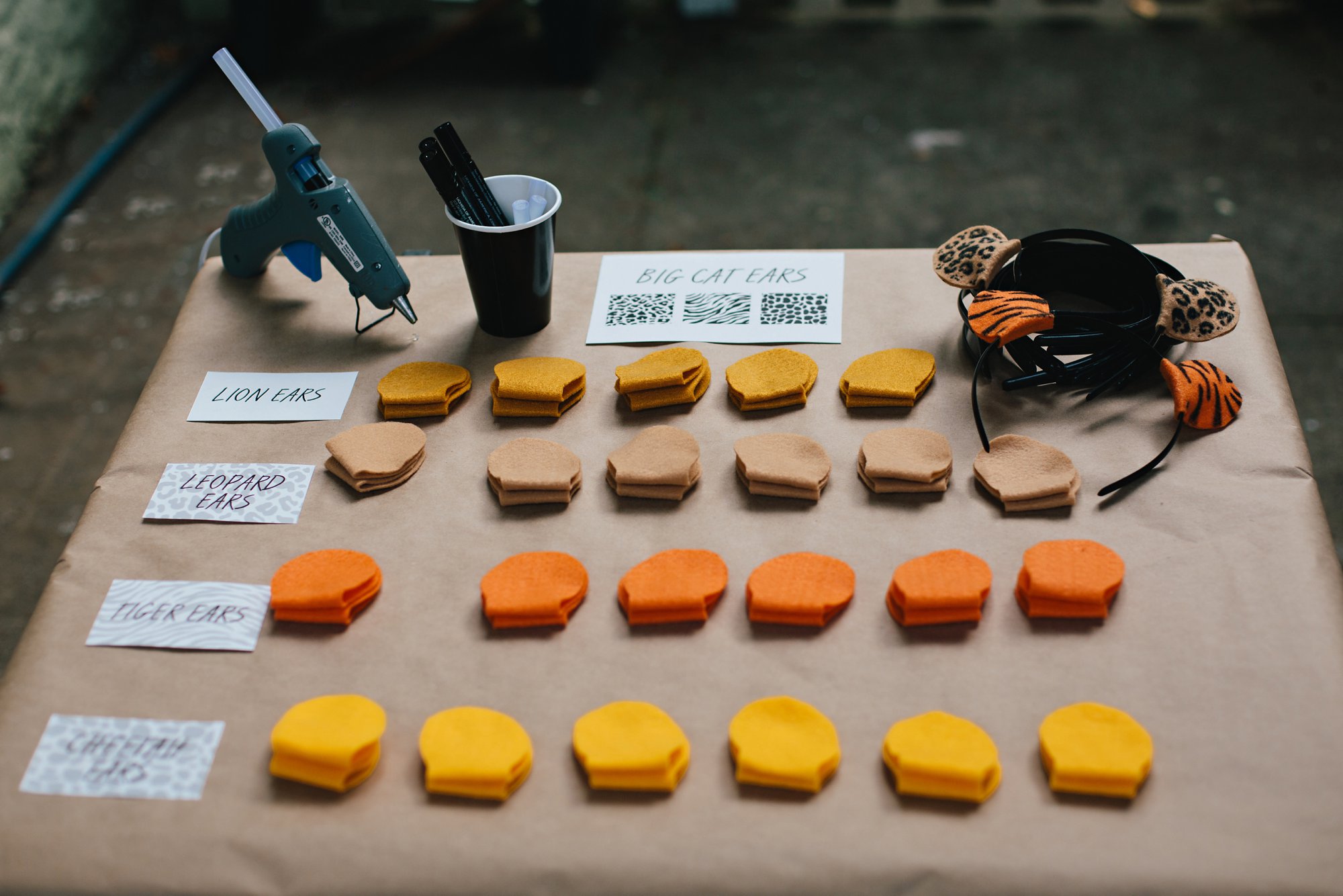 We planned a few crafts for the kids, including a station where they could create their own big cat ears (with the help of their parents). I bought simple black headbands and cut out little ears from different colored felt. We printed cards with each of the cats’ patterns and placed them next to the ears for reference, along with a few black paint pens for the details. It took just a couple of minutes and a few dabs of hot glue for these darling ears to come together!
