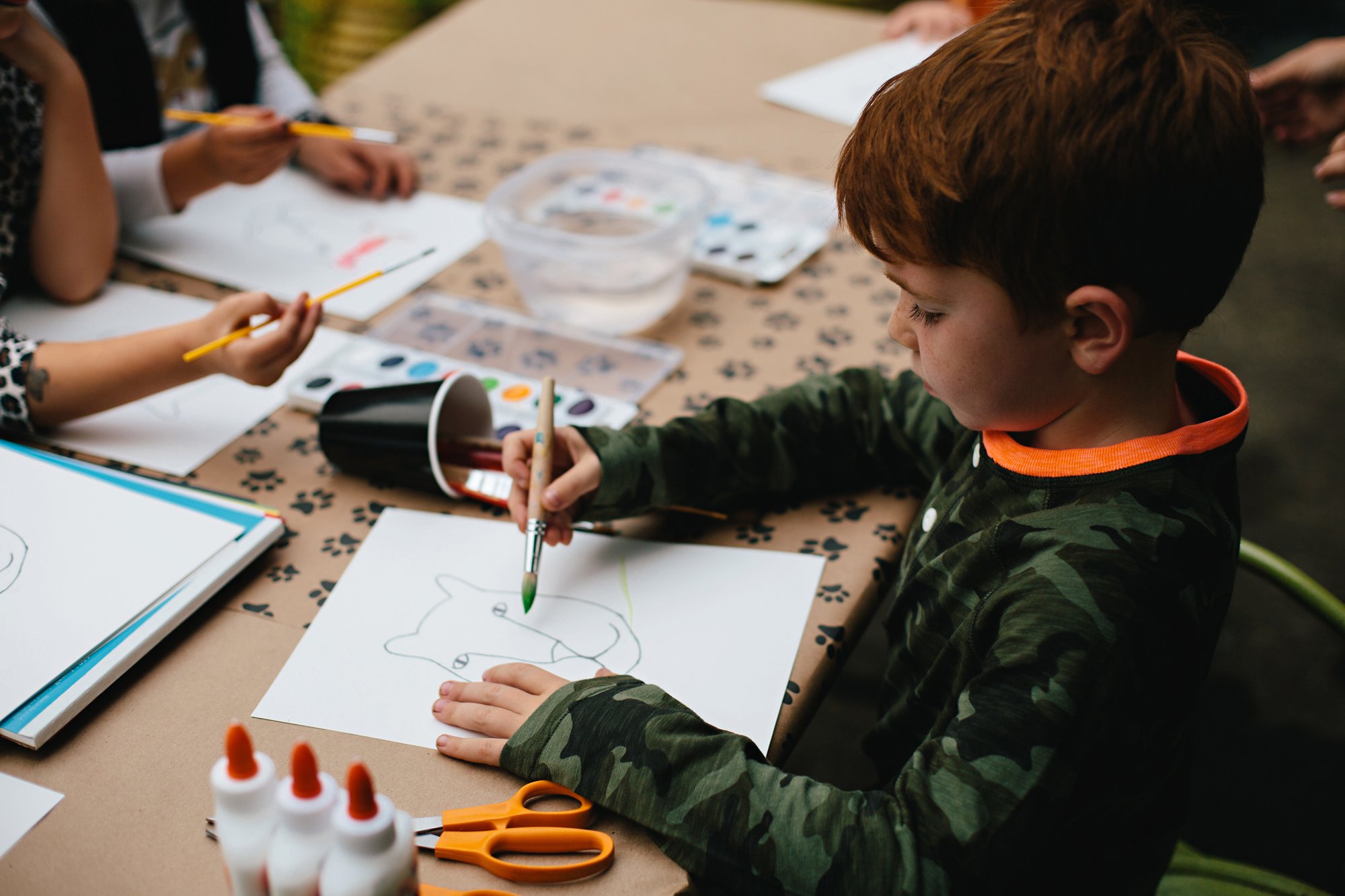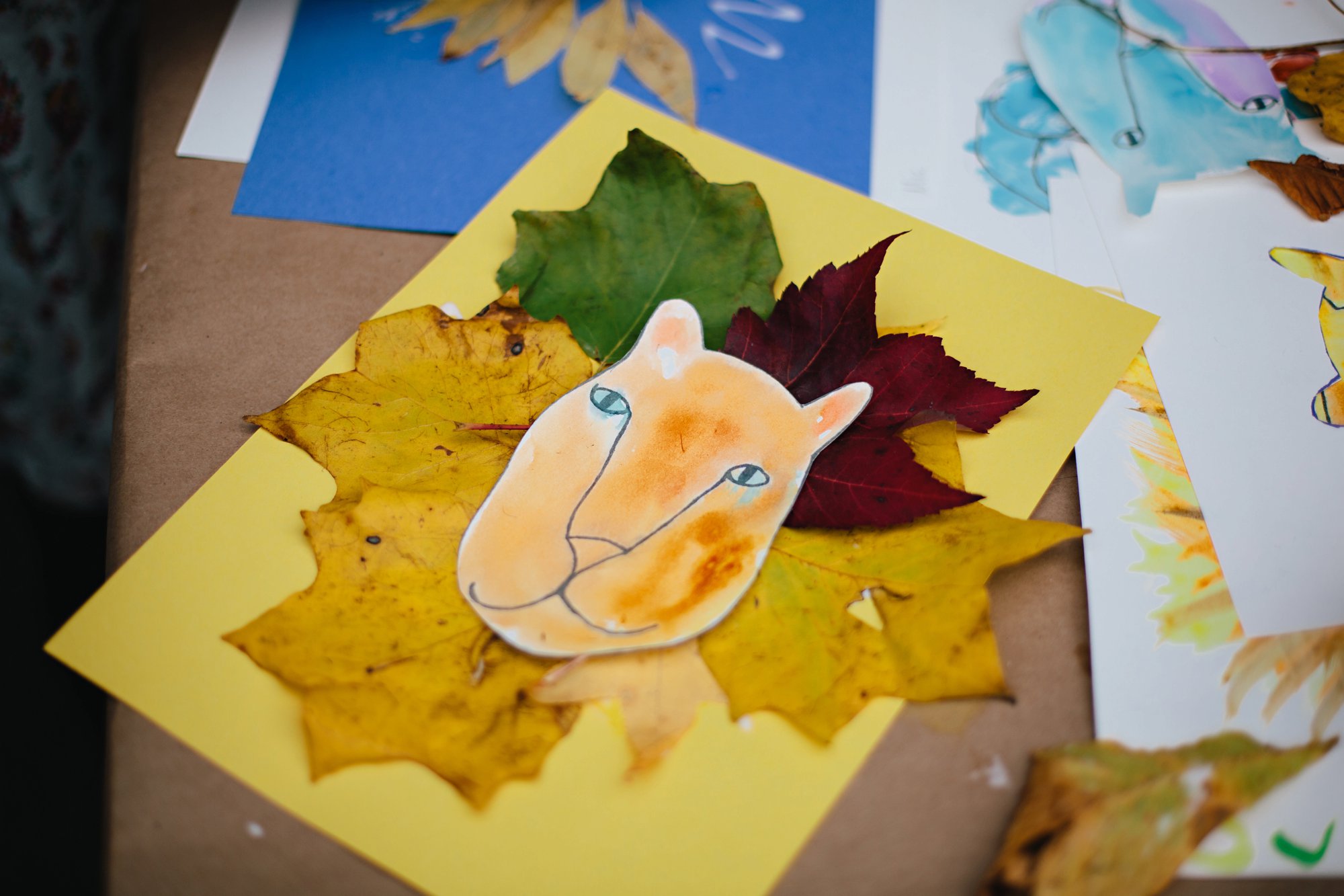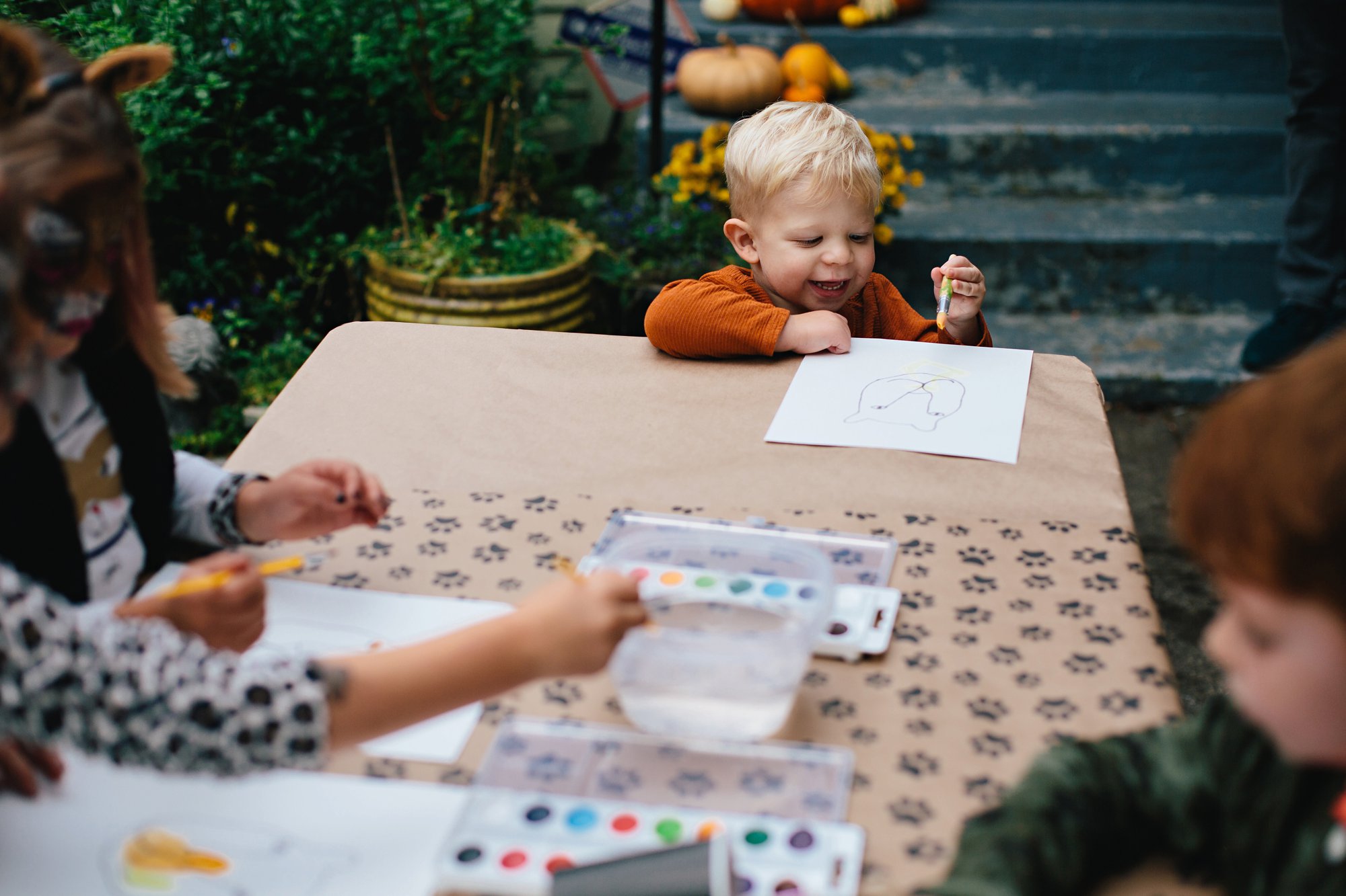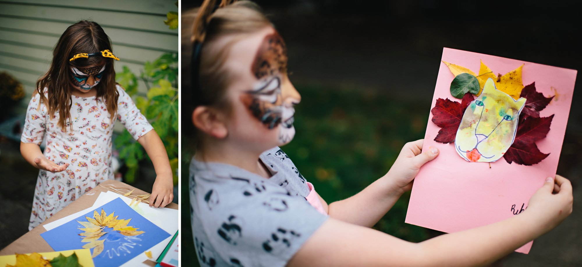 We set up a second craft station so the kids could make leaf lions– the perfect activity for a big cat celebration taking place in the fall. Isla sketched a lion face and we photocopied it on to sheets of watercolor paper for the kids to paint. While the faces dried, we took the kids on a walk around the neighborhood to collect leaves (and burn a little energy!). Then they used the leaves to create manes for the lions.