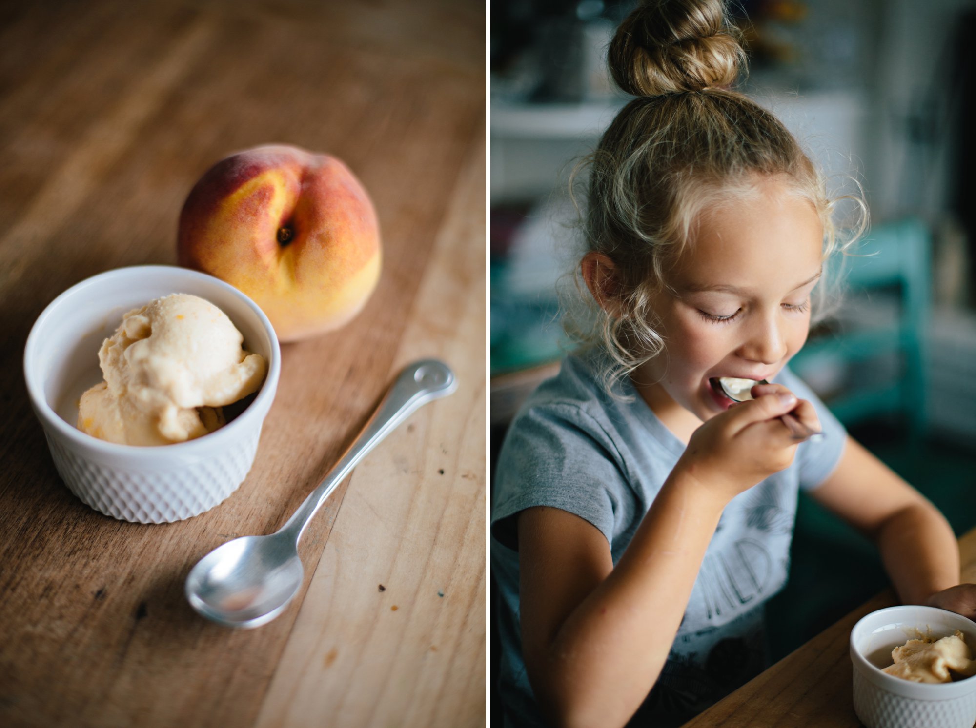 It turns out my mom didn’t always use the same recipe back then, but she remembered the ingredients. After a little internet searching we came across this recipe, added a little more peach, and it tasted exactly like the ice cream my mom used to make.