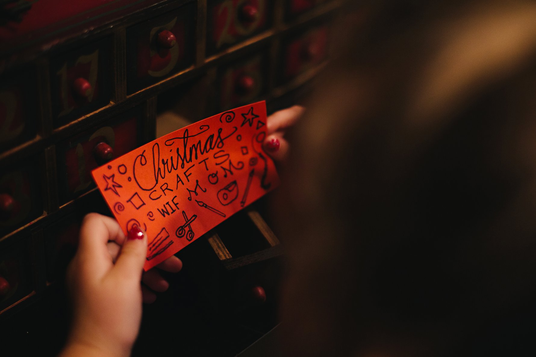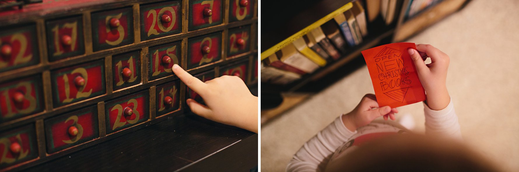 Our advent calendar is a box with little drawers. Isaac writes the activity for the day on a piece of paper (and if time allows and inspiration strikes, adds a few fun illustrations) and tucks it into the appropriate drawer.