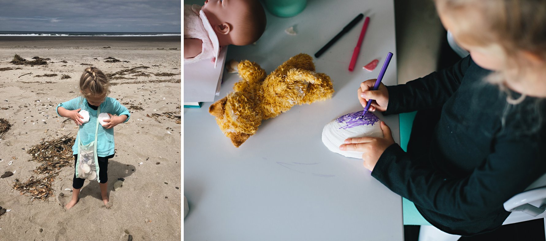 We collected a ton on our walk: 25 sand dollars, about a dozen teeny sand dollars, agates, rocks, snail shells, mussels, hollowed out barnacle shells, and more! Isla’s collection bag was stuffed full, and though it was heavy, she carried it the whole walk. She’s such a strong and dedicated collector! Like Isla’s collection bag, our hearts were bursting at the seams after our relaxing morning on the beach. We are so very grateful to call this magical place home. We’re already counting the days until we are back!