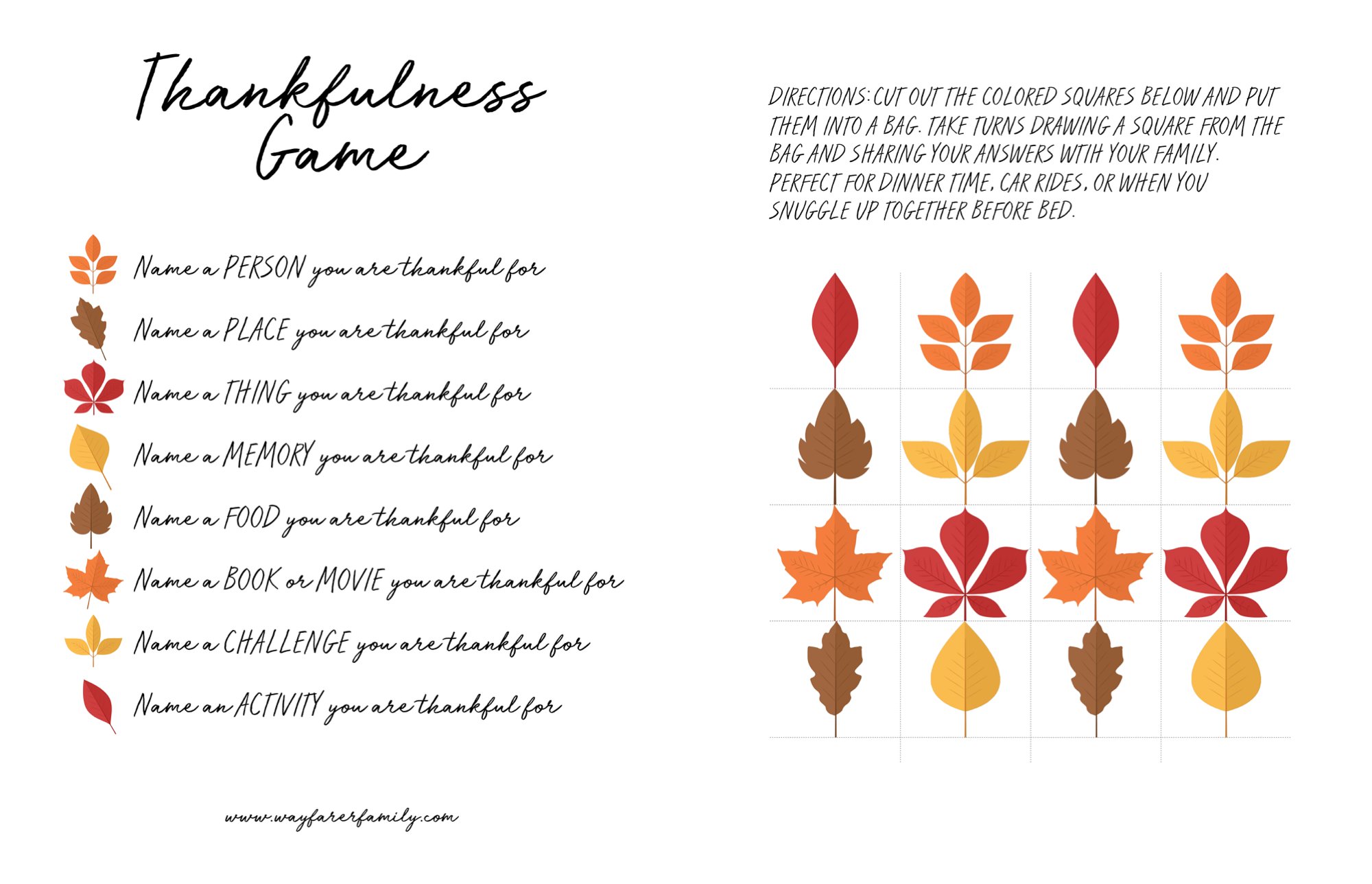 Play thankfulness games. Games are a such great way to connect and engage as a family! We put together a fun and simple game that encourages reflection and conversation. It’s perfect for dinner time, car rides, or when you snuggle up together before bed. Click HERE for your free printable download.