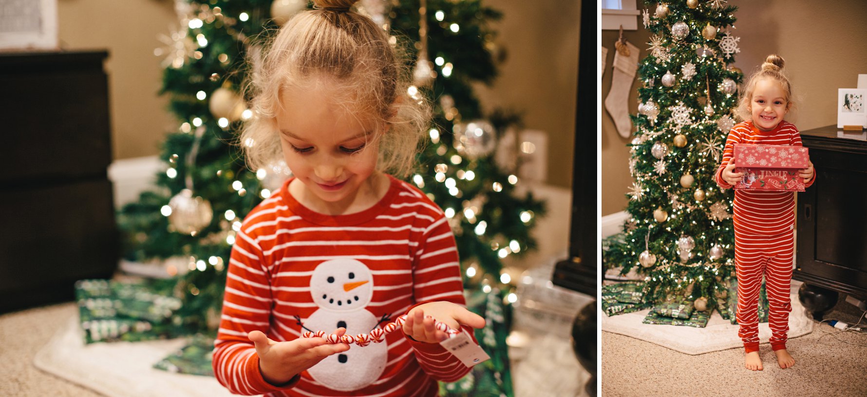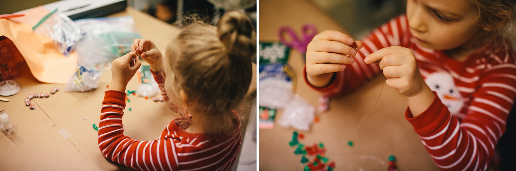 • jingle bells • sparkly pipe cleaners • felt • snowflake decorations • peppermint candy beads •tape • festive ricrac • popsicle sticks • clothespins • a wooden tree ornament to paint • sparkly pom poms • Lastly, I like to tuck an inspiration page of holiday/winter craft ideas I think Isla might enjoy (I referred back to our winter kiddo art projects inspiration board on Pinterest!) into the box. The crafts on this page all use the supplies I included in the box. Sometimes we replicate the crafts, and other times we use them as a jumping off point for our own projects!Aaaaand, just like last year, of all the wonderful sparkly treasures in the craft box, Isla was most excited about her own scotch tape!!! She gasped and then excitedly shouted, “My own scotch tape?!” What’s even more hilarious is this is the same leftover roll from last year! Isla got straight to work crafting! First she made jingle bell and peppermint candy bead necklaces. Next we made the sweetest, simplest window ornaments using my laminator. Last year I asked for a laminator for Christmas. Yes, seriously. I had a bunch of project ideas floating around in my head, and so it seemed like a completely logical gift request