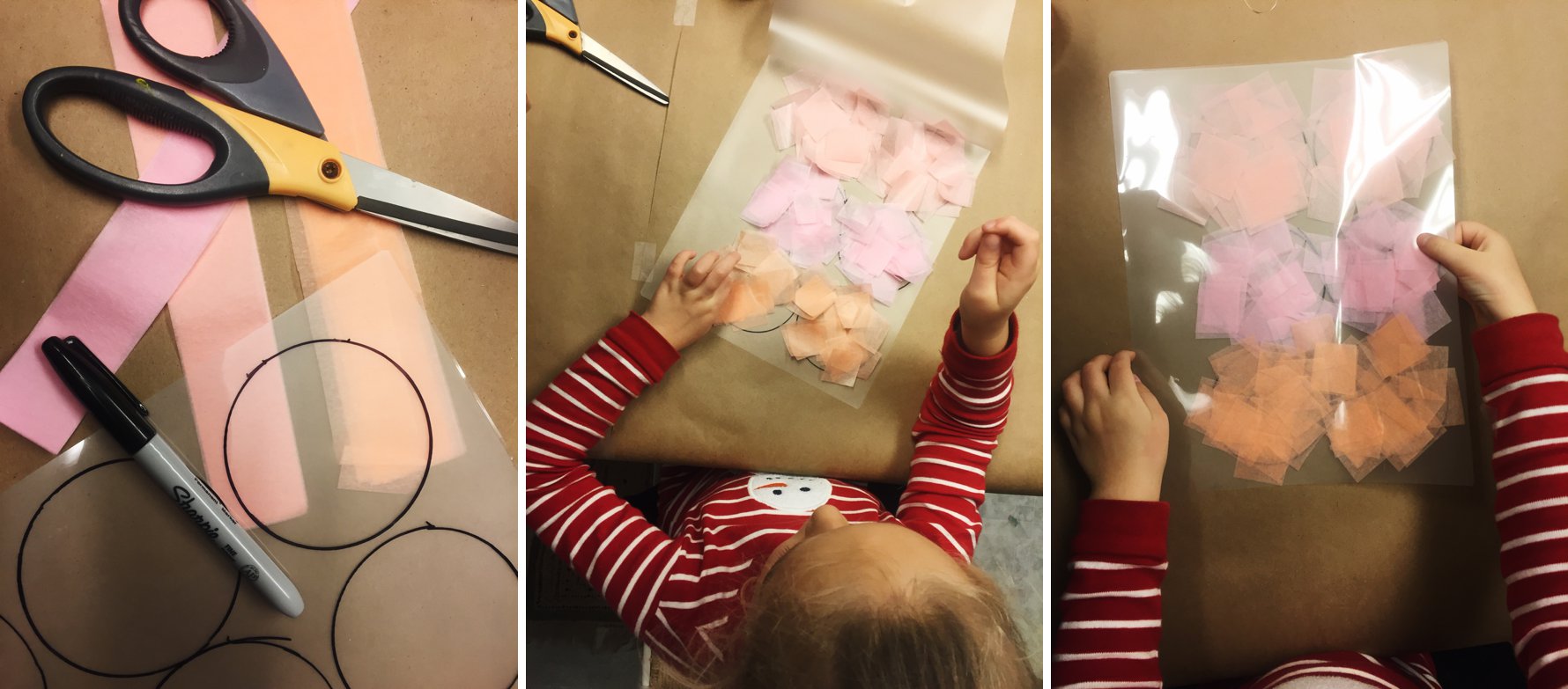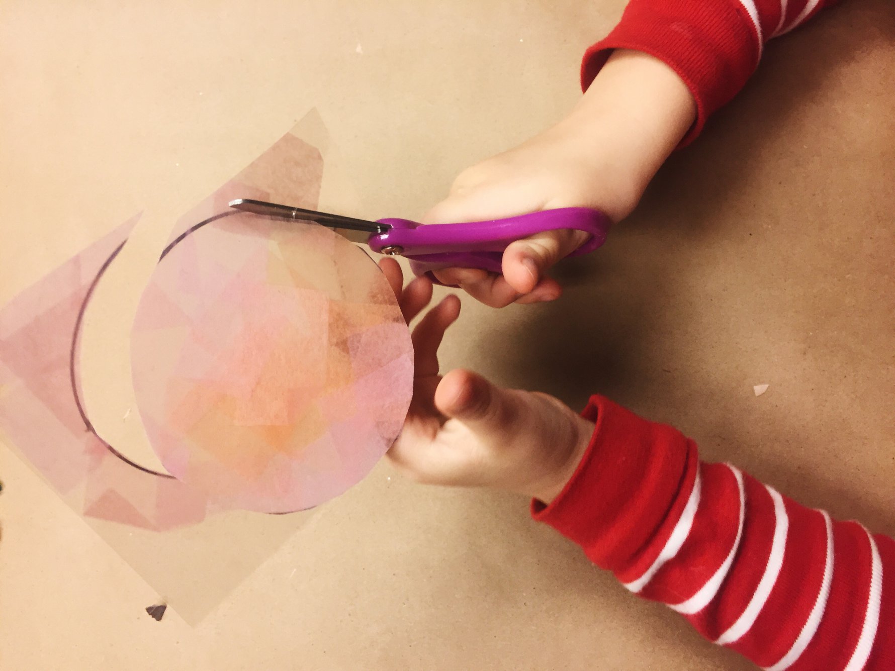 We traced circles onto the lamination sheets with a sharpie and Isla filled the circles with squares of tissue paper.