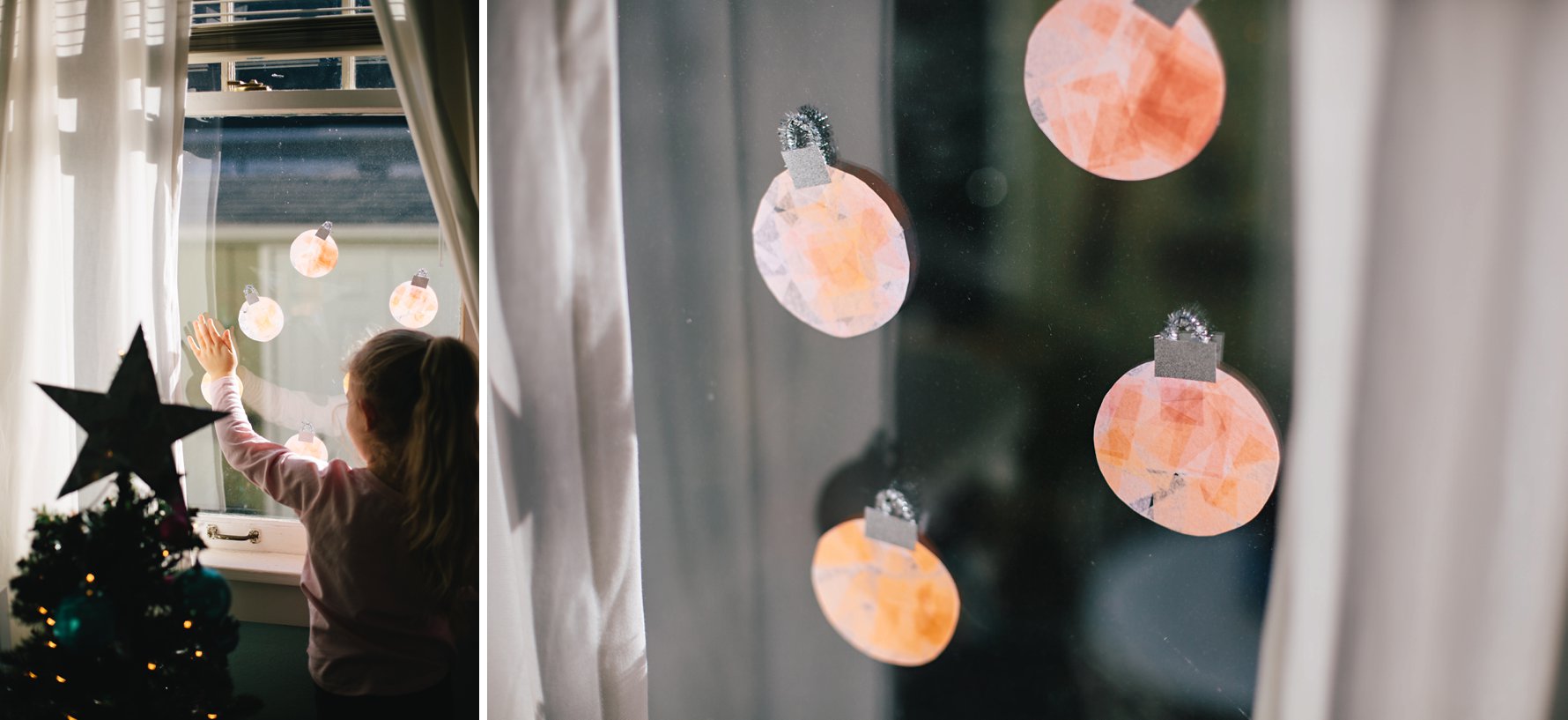 After running the sheets through the laminator, we cut out the circles. Then we glued a little square of glittery paper onto each (the ornament topper) and attached a sparkly pipe cleaner hook with a dab of hot glue. The ornaments look so bright and festive on Isla’s windows! This was such a fun and easy project. Get yourself a laminator!