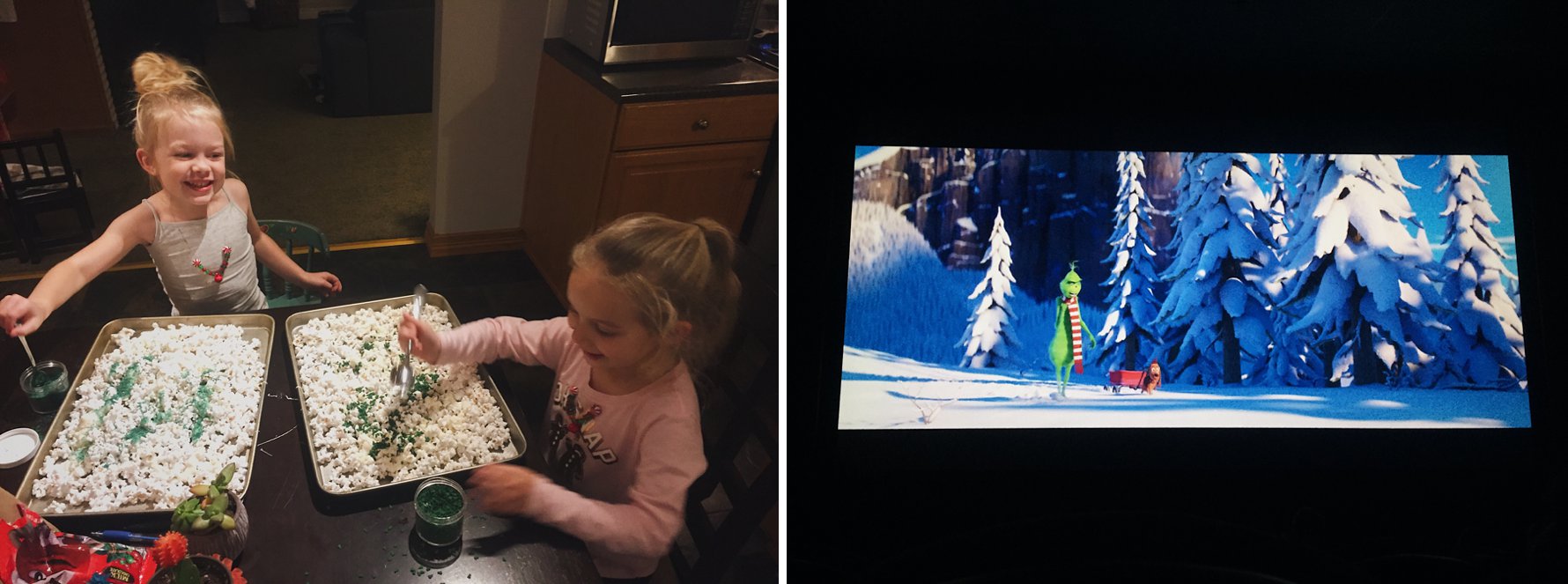 In preparation for the movie, we made a green Grinch-inspired popcorn treat. We drizzled while chocolate and green sprinkles over the popcorn and then tossed it with holiday m&ms. So festive and tasty!