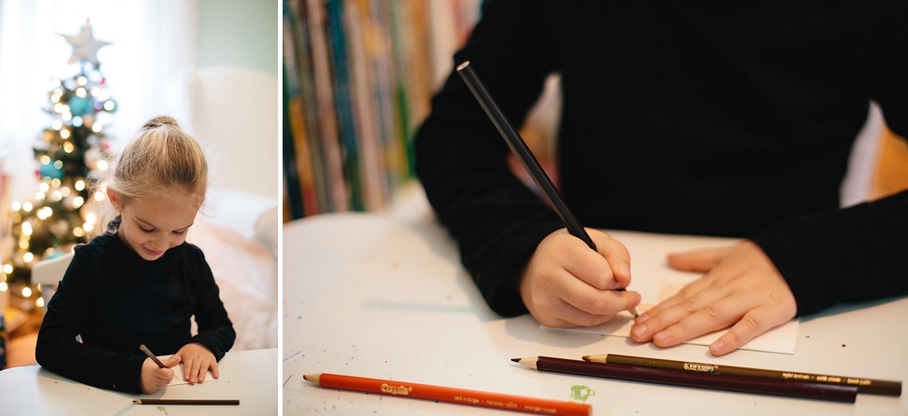 Isla unwrapped this cute deck of Santa playing cards (from the Target dollar section last year) and we used them to play memory! I’m looking forward to using these cards to teach her a few new games, like slap jack and war. Advent Activity Day 6: Write a letter to Santa.Isla worked hard on her letter…while Colina dressed up in her jewelry!“Dear Santa,