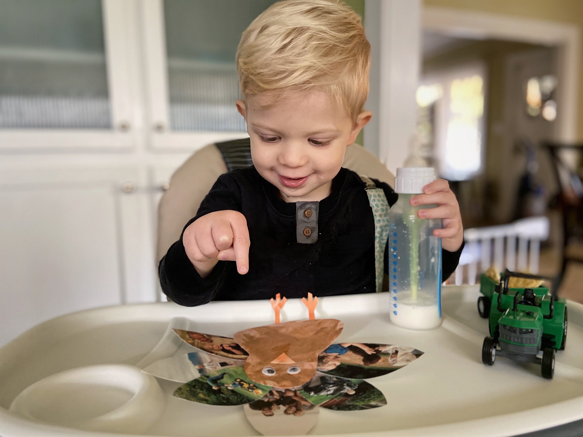 9. Display the Thankfulness Turkey someplace your child can see it regularly and refer to it when you discuss the concept of thankfulness. Look at the turkey together and continue to reiterate why your child is thankful for the people, places, and things pictured. It only took a day before Cole would look at his turkey, point to the photos, and excitedly say, “I thankful dump truck!” Baby steps towards building that understanding! Woo hoo!