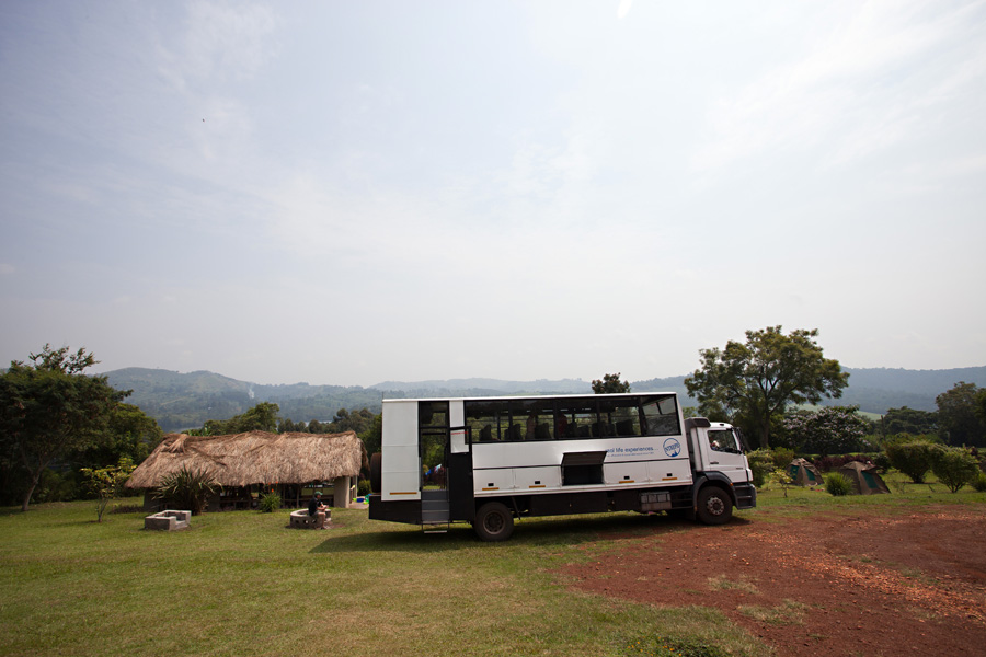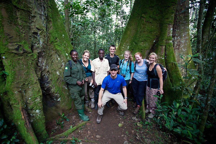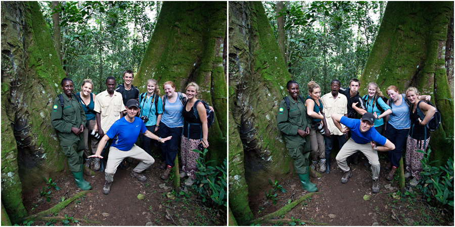Shortly after returning from our hike, we boarded the bus and drove deeper into Kibale National Park to go chimping. As we lumbered down the road, our tires kicked up Africa’s infamous rusty dust, as well as flurries of fluttering butterflies- we’ve never seen so many winged beauties in one place! Once broken into smaller hiking groups, we met our guide, Harriet. She first explained that the ants of the forest not only have a terrible stinging bite, but also an affinity for private parts. So, as we were carefully tucking our pant legs into our socks, she also explained that she and the other guides had ideas of where the chimps might be, because of where their food was growing. “If you had mice in your house, you’d know where to find them because you know where your food is kept. Just as you know the house, we know the forest.” With that, she turned sharply in her tall rubber boots and tromped into the forest.
